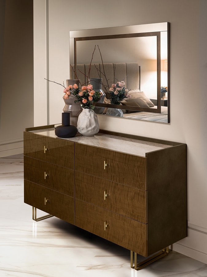 Los paneles laterales de bronce mate y los perfiles en oro satinado de color champán introducen un contraste refinado, enfatizando los volúmenes y añadiendo un toque precioso que eleva la sofisticación general de la colección.