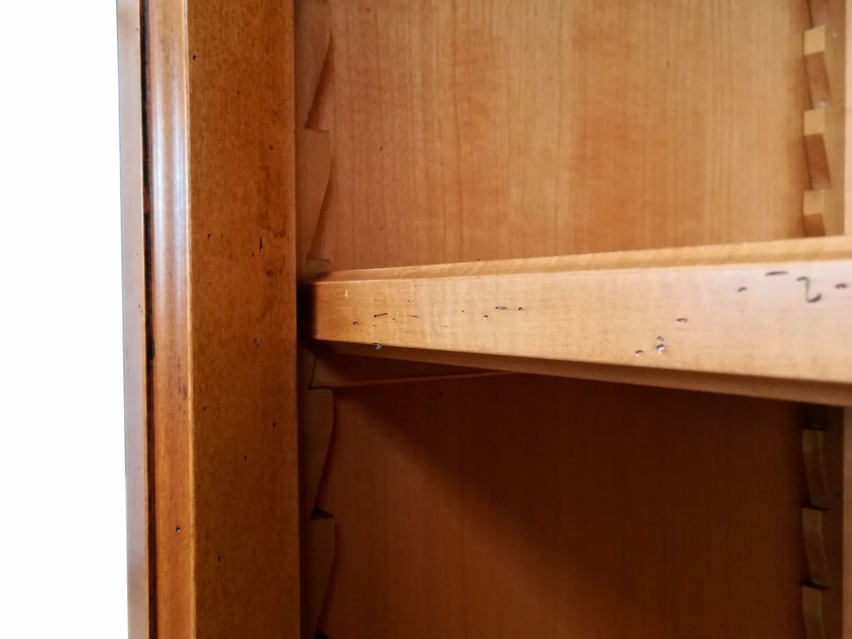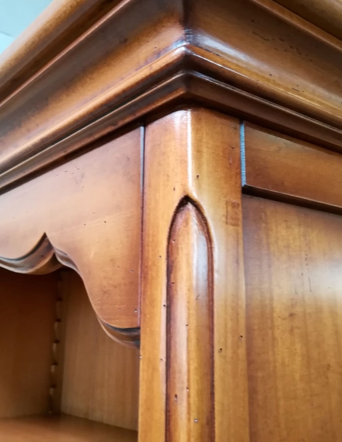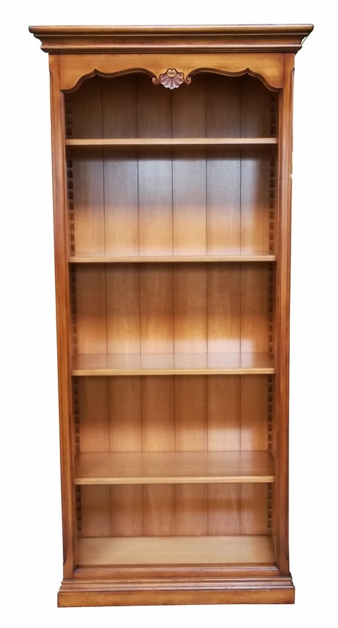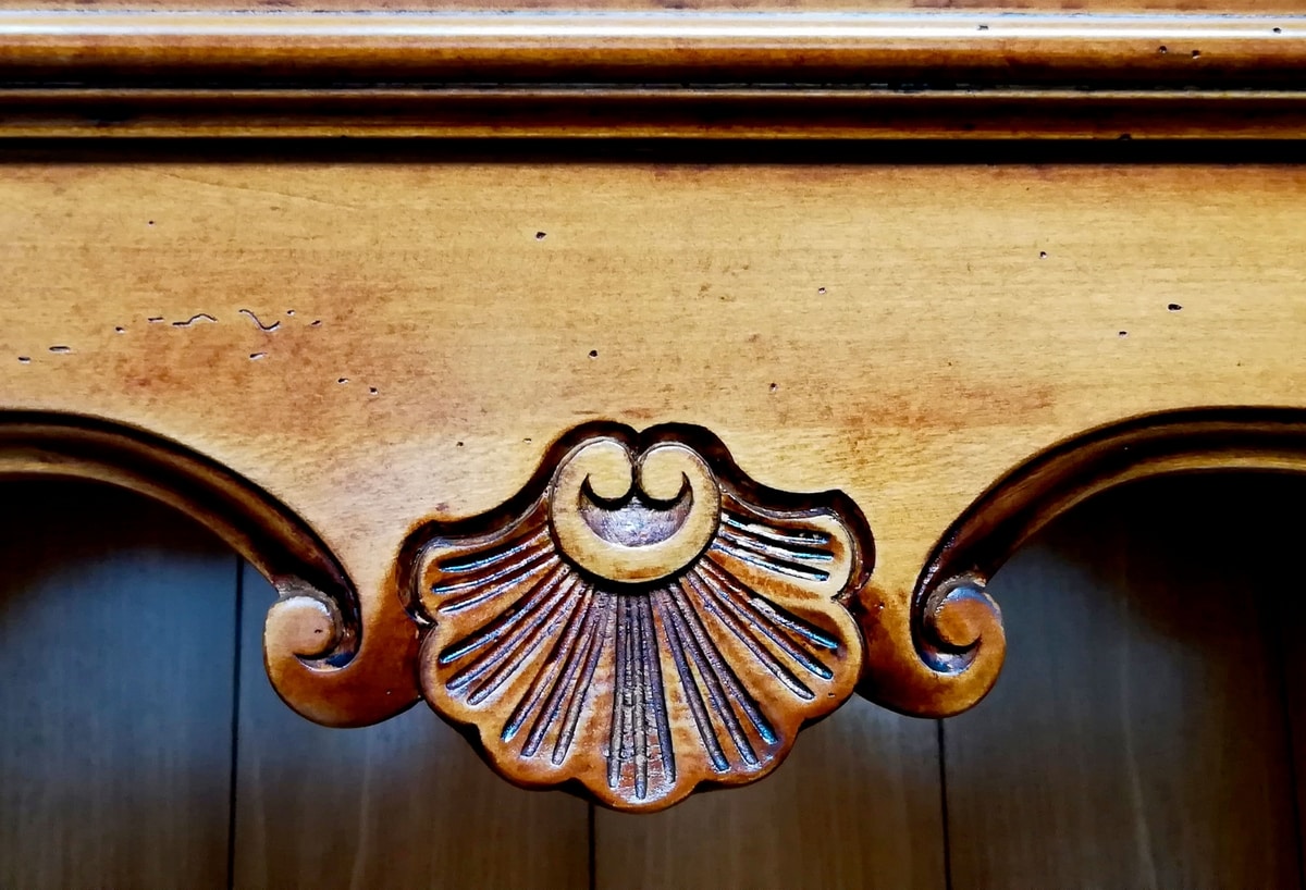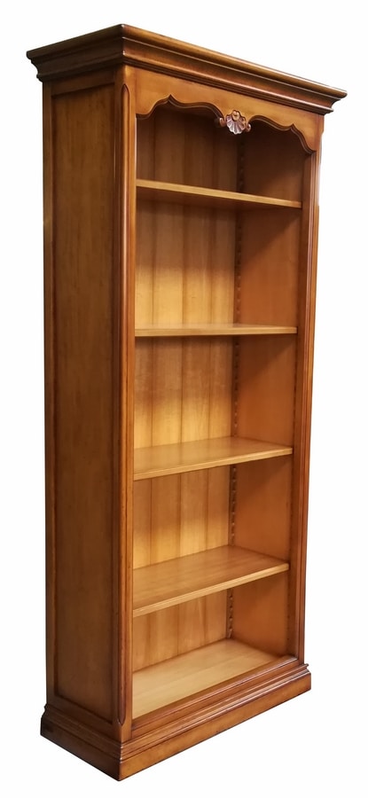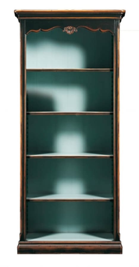 Librería abierta de inspiración provenzal con cuatro estantes, regulable mediante peldaños de madera en el respaldo con listones grabados. Cymatium en forma con una decoración central tallada a mano, pilares angulares decorados. Zócalo lineal con moldura simple que se recuerda en la cornisa.