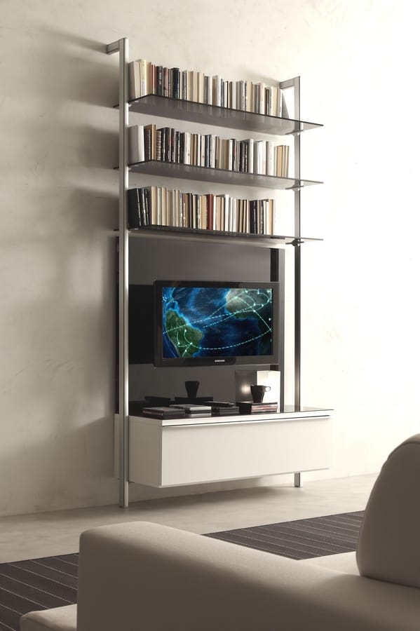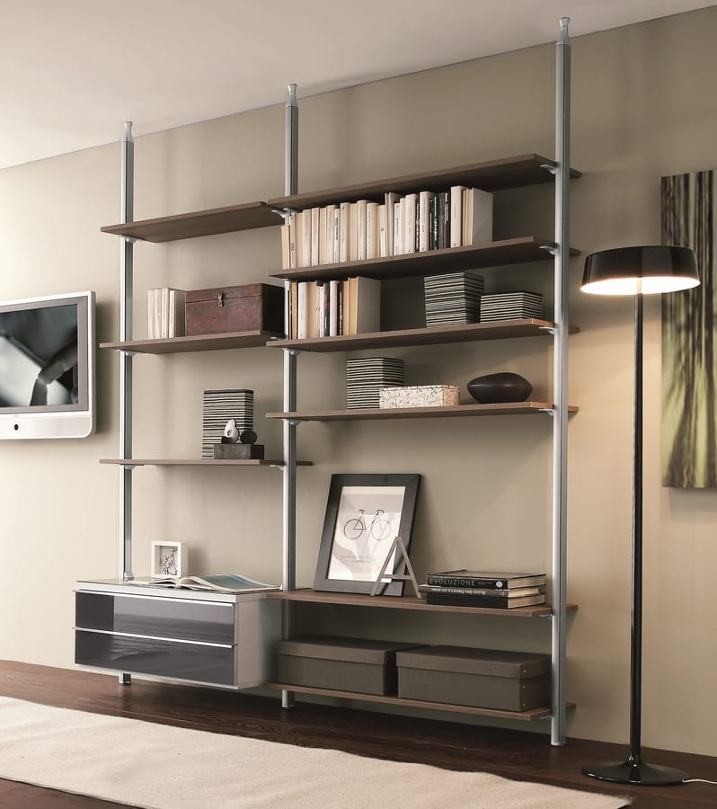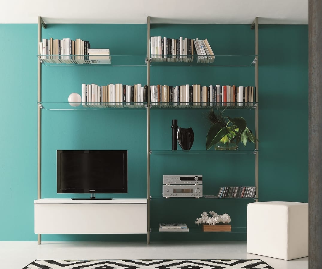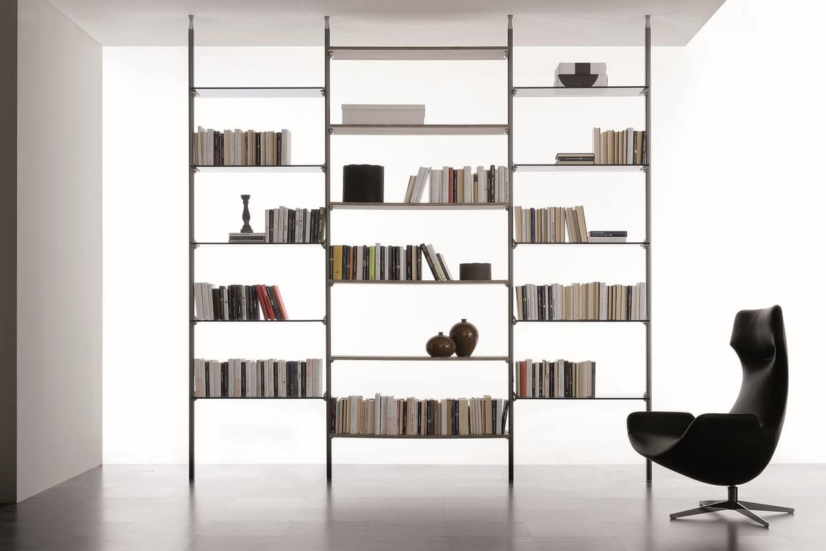 Solicitar precios Productos similaresLibrería de pared o una al lado de la otra, altamente personalizable, en medidas y diseño, perfecta para diseñar una pieza de mobiliario moderna para la sala de estar que se adapte a cualquier tipo de entorno. Soporte de aluminio con fijación a la pared / fijación al techo, a gancho de vidrio / madera lacada / base de melamina superior que se puede colocar a cada altura. El sistema modular también es adecuado para walking-closet. Todos los elementos se pueden realizar con flexibilidad de formas y colores.