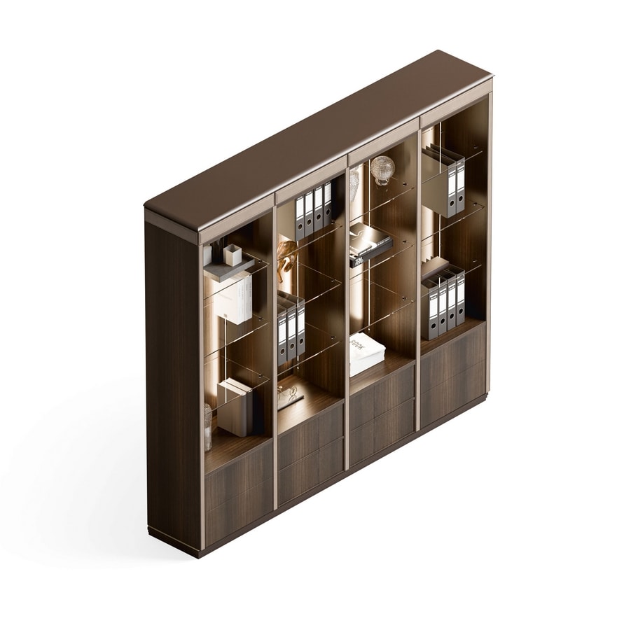 Estantes: vidrio de 6/10 mm de espesor o en madera lacada o espesor encendido 25/35 mm.