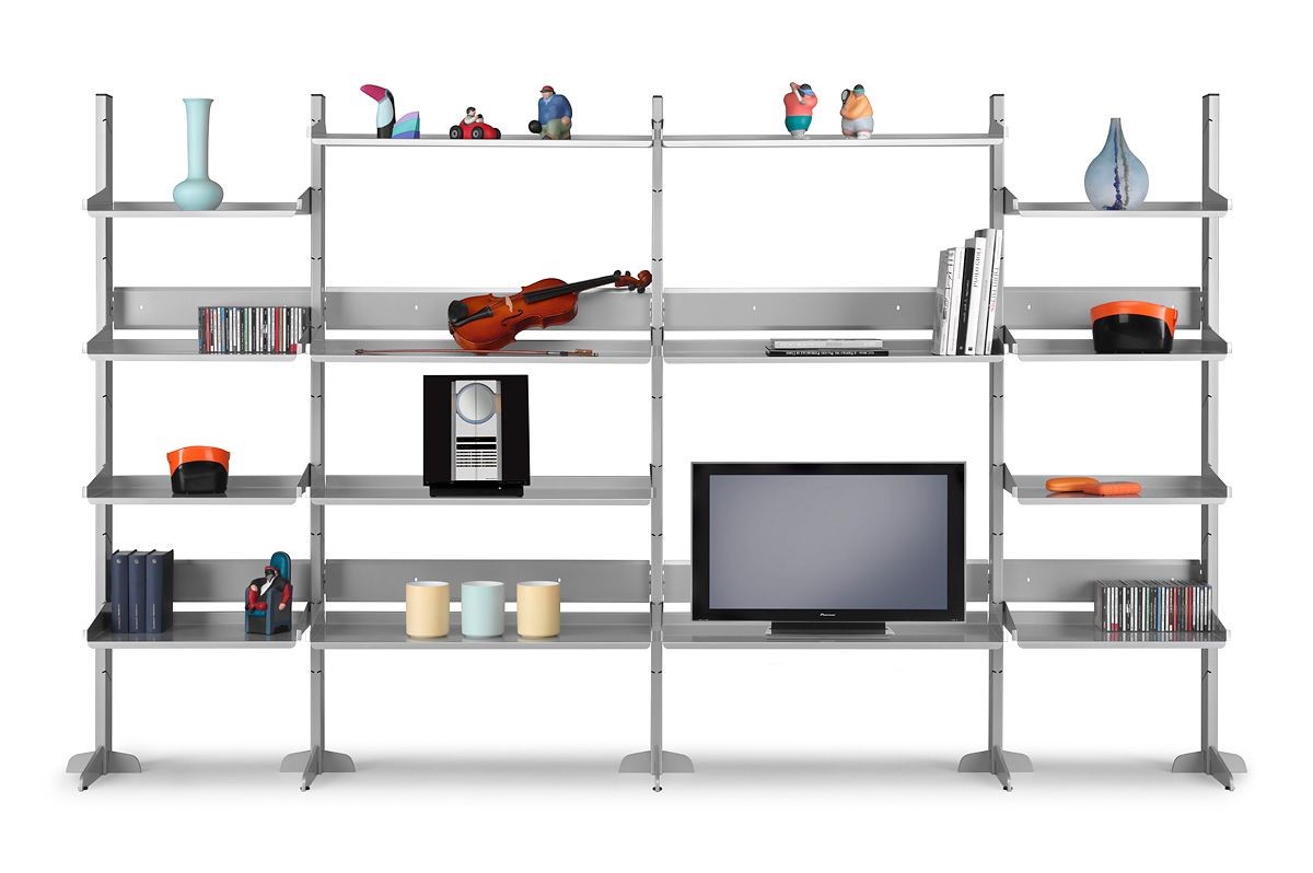 Muebles modulares con estructuras metálicas en varias alturas y pies con juntas universales.