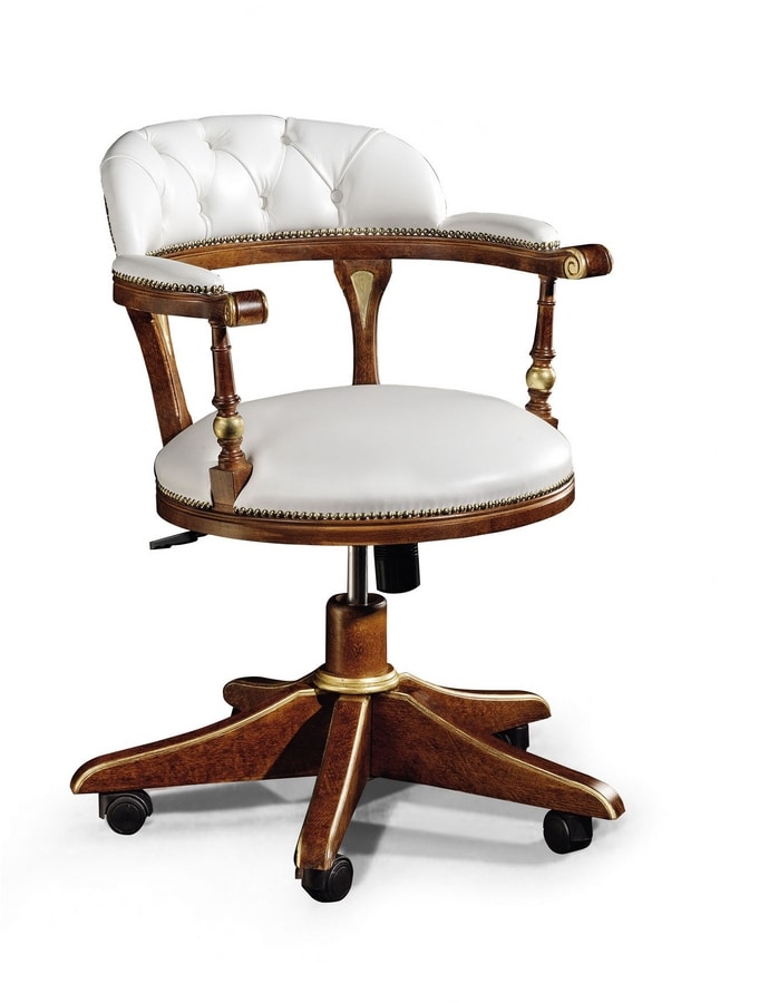 Sillón giratorio para una oficina de estilo clásico. Asiento redondo y reposabrazos cubiertos de cuero blanco. COM Backding Capitonné. Base en madera en castores, giratorio y altura ajustable.