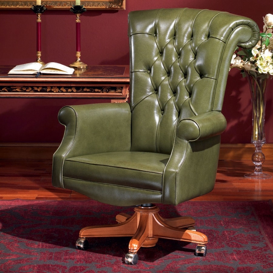 Solicitar precios Productos similaresEsta silla de oficina es ideal para quienes buscan el máximo confort; la tapicería estándar capitonné realza especialmente el lujo de este modelo donde se utilizan pieles naturales de primera calidad, teñidas en anilina, flor plena flor acabada con pigmentos de efecto bicolor, aspecto semibrillante.