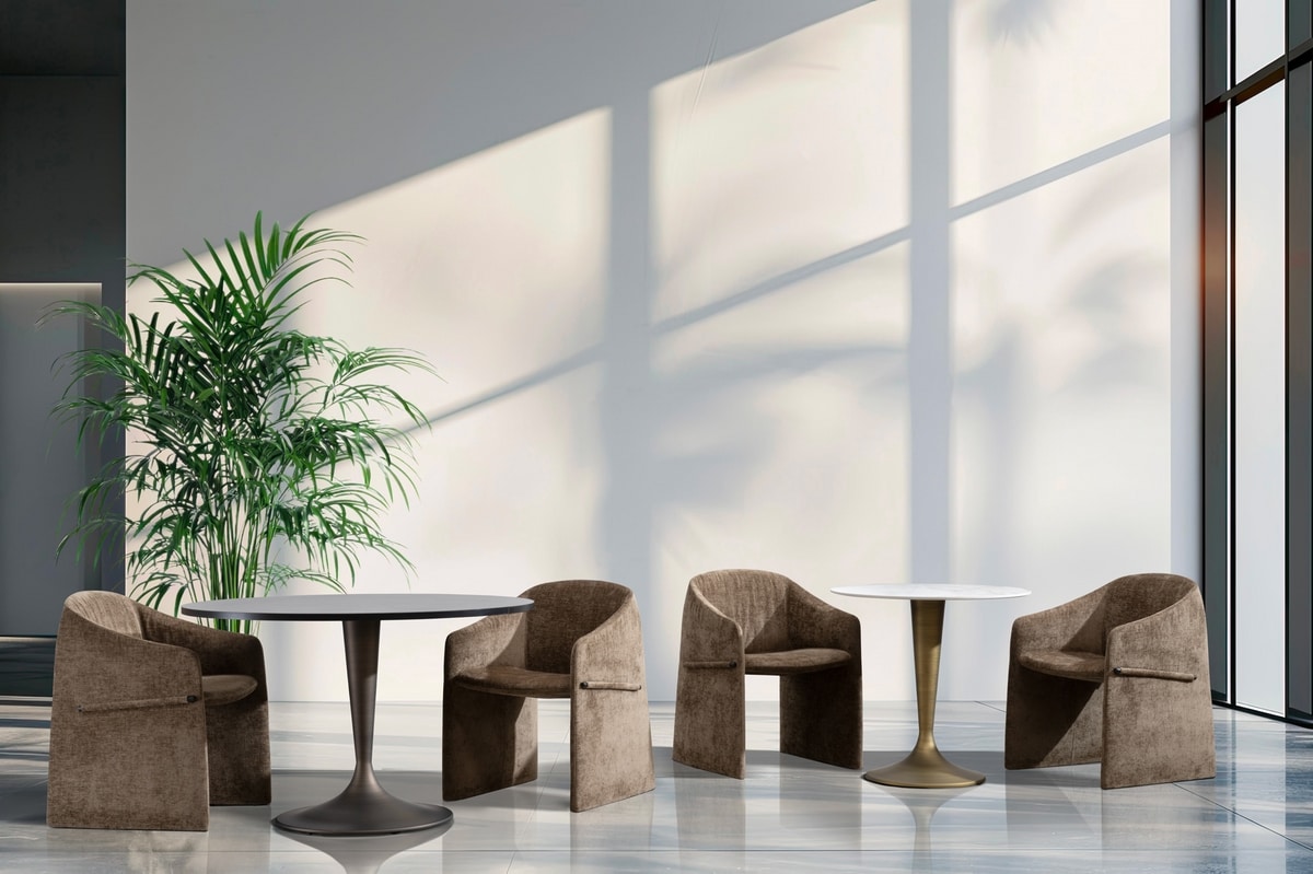 La colección de mesas Glen redefine la elegancia de los ambientes interiores, fusionando diseño sofisticado y máxima versatilidad. La forma escultórica de la base, en los preciosos acabados dorados o bronceados, contribuye a dar un aspecto lujoso a la mesa tanto con tableros redondos como cuadrados. Una elección ideal para valorizar cada ambiente con un toque de refinamiento exclusivo.
