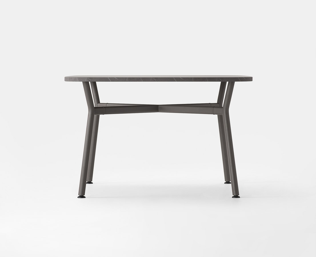 La estructura en forma de cruz de arquitectura minimalista y escultural. Los sólidos y generosos montantes de tubo redondo se unen a los elementos de conexión horizontales ovalados, creando un soporte invisible potente, de equilibrio perfecto entre rigor industrial y delicadeza formal.