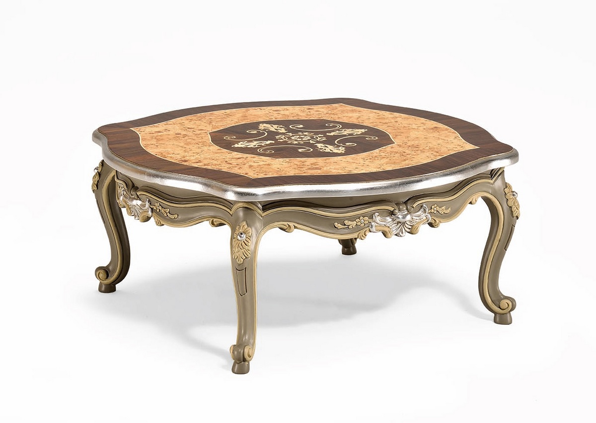 Mesa de centro con elegantes tallas hechas a mano y decoraciones de hoja de oro.