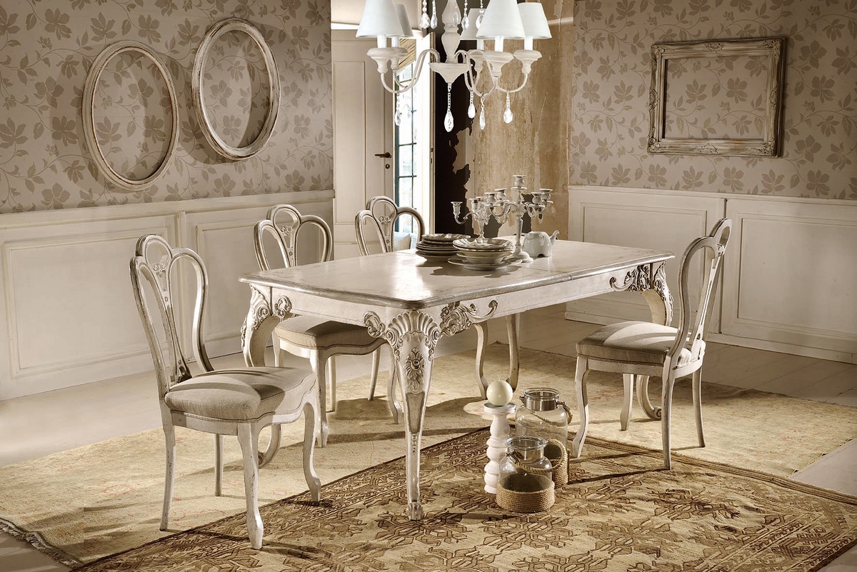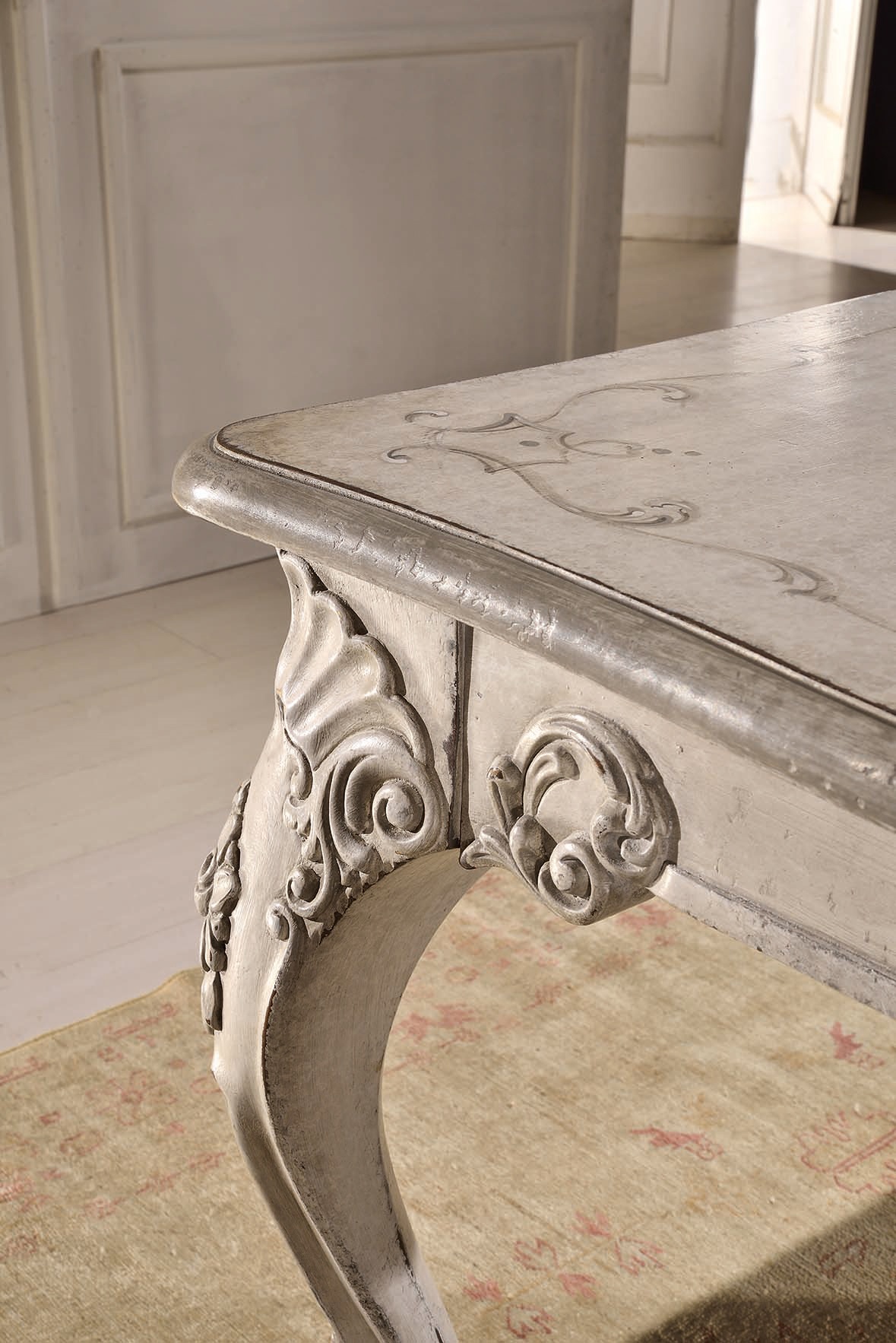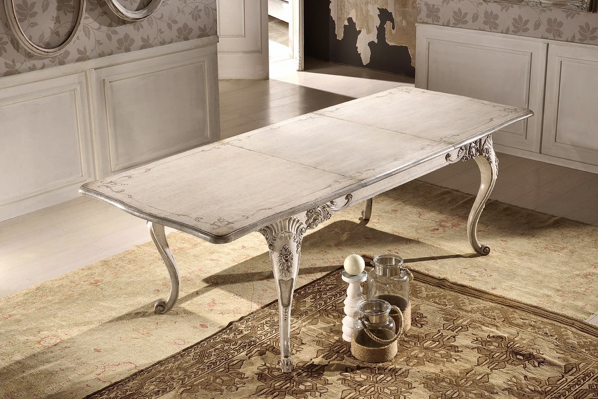Mesa rectangular con extensiones, con acabado blanco antiguo provenzal, con hilo gris.