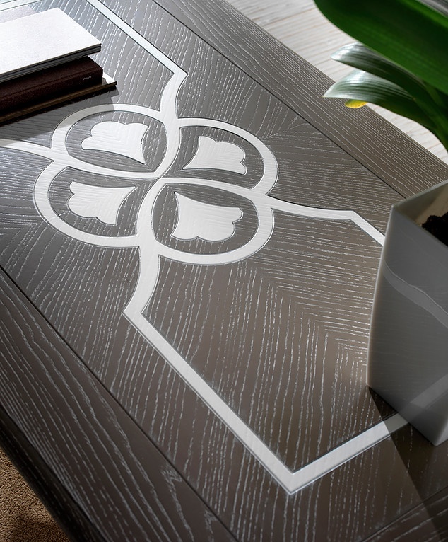 Las tablas de Villa Foscari se hace totalmente en cenizas cepillado, con un uso inteligente de las decoraciones en relieve y acabados de dos tonos.