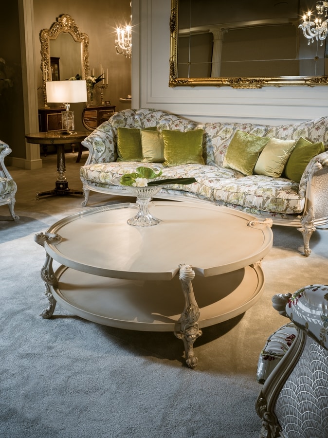Mesa de centro de estilo clásico con acabado lacado y pulido con colores policromos y plateados y pátina final. Posibilidad de otros acabados. Las dos tapas de madera están unidas por patas hábilmente talladas a mano. Se acompaña de la mesa auxiliar con dimensiones más pequeñas. Con nuestras colecciones de salas de estar clásicas de lujo, podemos amueblar las áreas de descanso de la casa y hacerlas acogedoras, manteniendo la elegancia representada por los diversos estilos y acabados refinados.