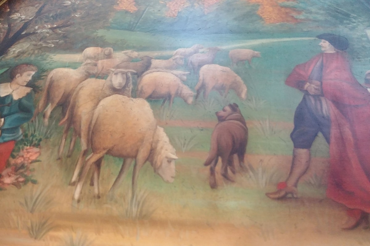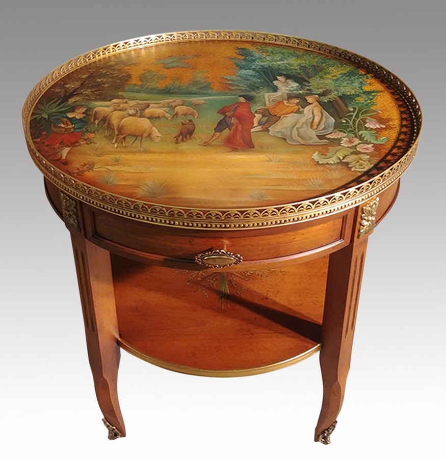 Mesa redonda de nogal con cajón. La parte superior está pintada a mano con una escena bucólica de pastores y damas, mientras que el borde es de latón finamente cincelado. El estante abierto en la parte inferior también está pintado a mano con un diseño floral, mientras que la estructura está teñida y patinada (código: VR96).