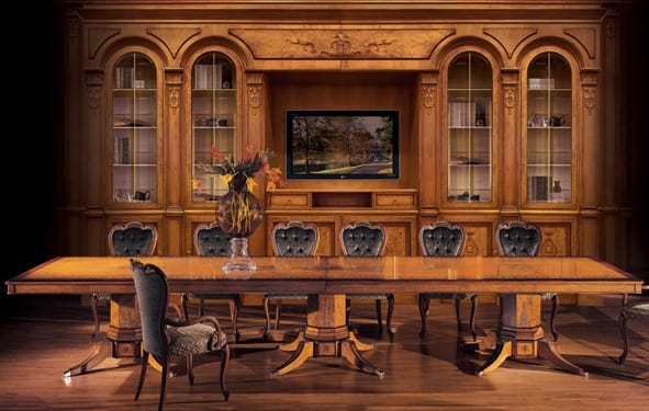 Solicitar precios Productos similaresMesa de estilo clásico. Hecho de mirto briarwood con incrustaciones de caoba, en acabado teñido de cerezo con detalles en oro y negro. En nuestras colecciones hay varios modelos de tablas con incrustaciones. Para dar la bienvenida a nuestros invitados para el almuerzo, hemos creado hermosas mesas de lujo, que decoran las habitaciones con gusto. Los numerosos modelos de mesas con incrustaciones Bellotti Ezio se reproducen en diferentes tamaños, para insertarlos de forma armoniosa en los distintos comedores o salas de reuniones. Ofrecemos habitaciones que siempre están completas con vitrina, aparador y vitrina. En la mesa puede combinar muchos tipos de sillas para las cuales el acolchado está disponible en una amplia gama de telas de lujo para elegir.