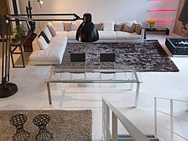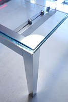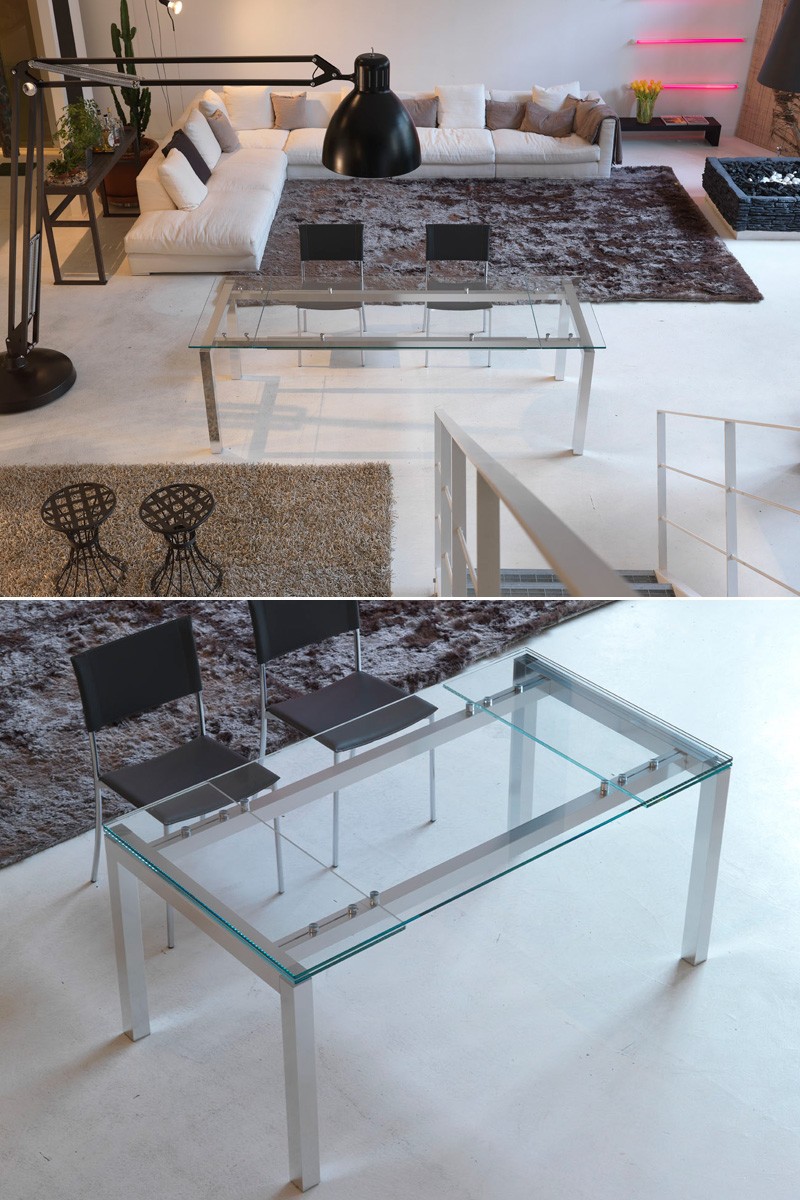 Mesa de comedor extensible en ambos lados, con una estructura de aluminio y guías de rodaballo, o con estructura de metal esmaltado y guías de aluminio esmaltado. Plano central y ultraligera gato transparente templado. "P" de 10 mm de extensión de vidrio grueso.