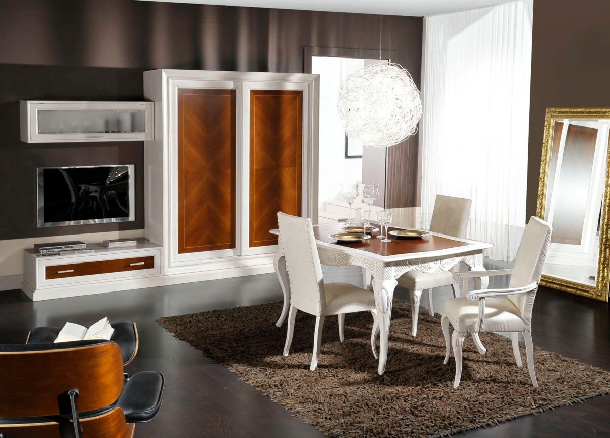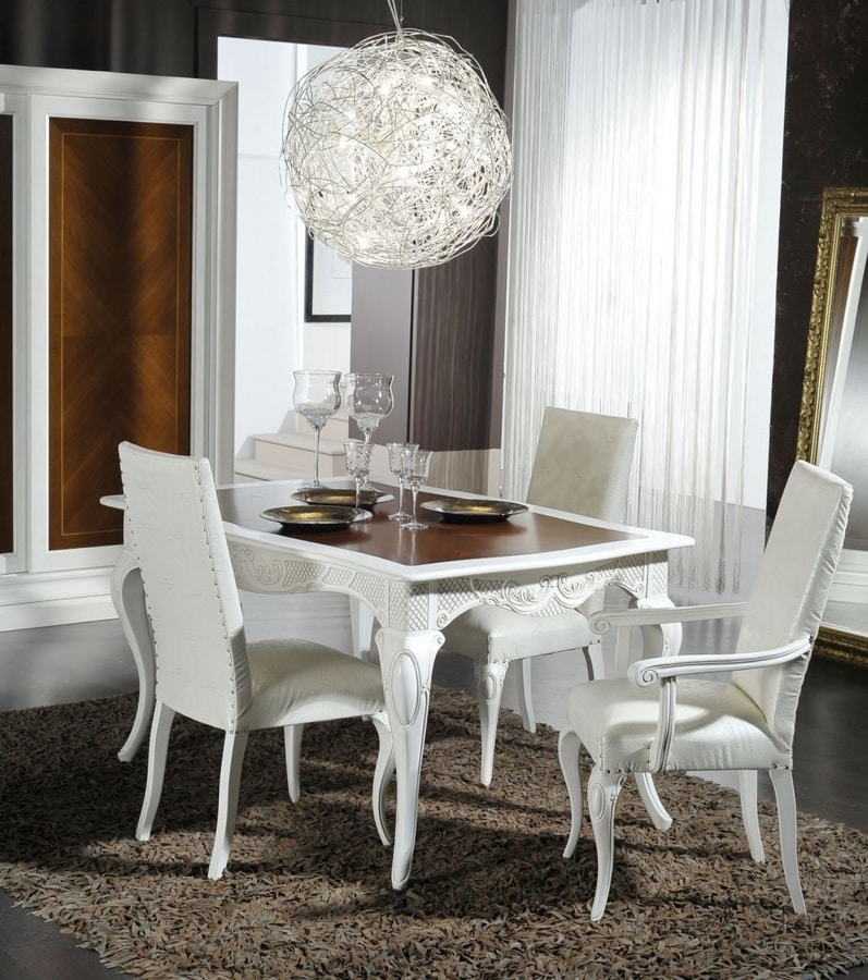 Mesa de comedor en madera lacada en blanco con detalles tallados. Tapa en acabado nogal.