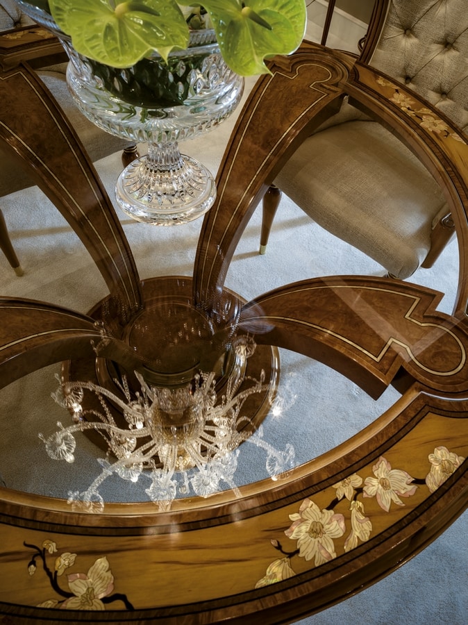 Solicitar precios Productos similaresMesa de comedor con incrustaciones de lujo. Briarwood de castaño en acabado brillante con una hermosa incrustación floral en nácar en la banda que rodea la parte superior de vidrio. Posibilidad de proyectos a medida para amueblar habitaciones de prestigio y ambientes lujosos, gracias a la combinación con la vitrina y el soporte de TV con el mismo acabado e incrustaciones.