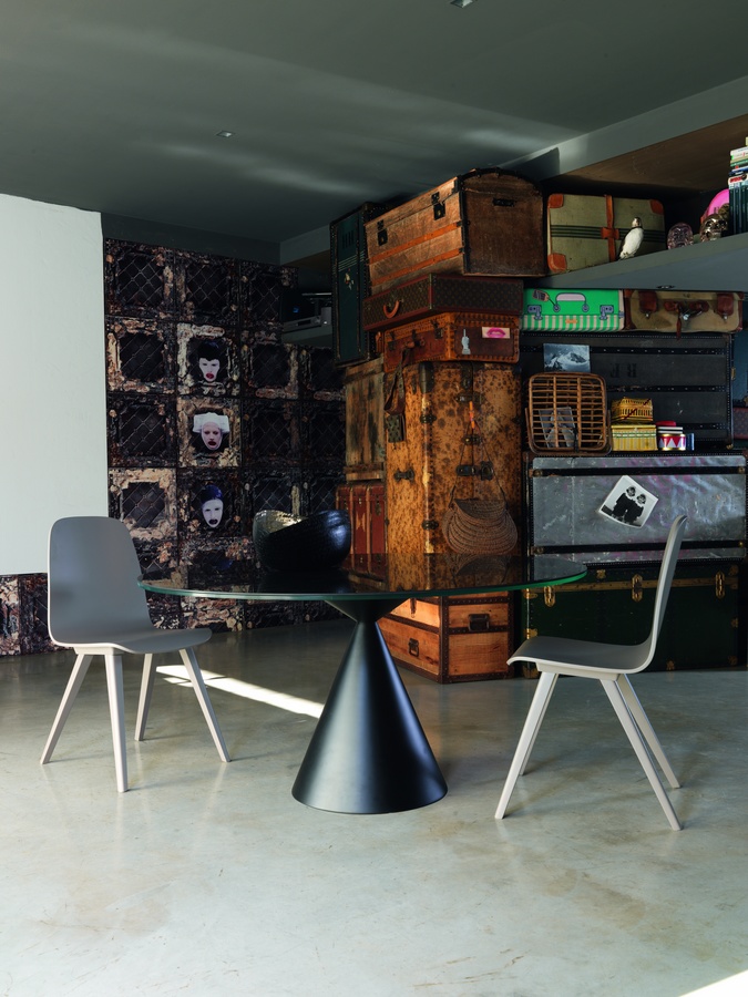 Mesa con doble cono básico y tapa de cristal de cerámica
