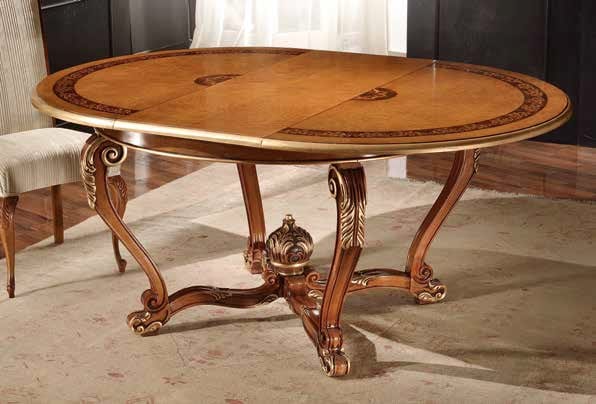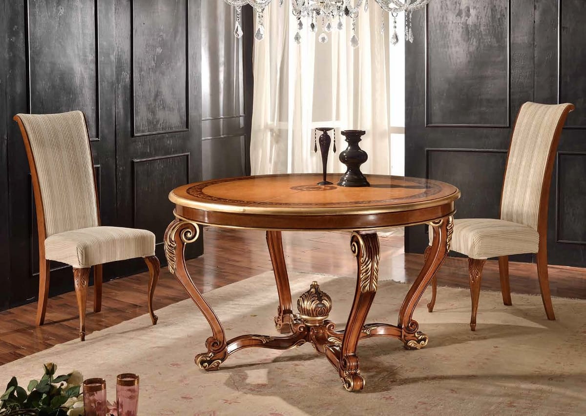 Mesa redonda de madera extensible, estilo clásico.