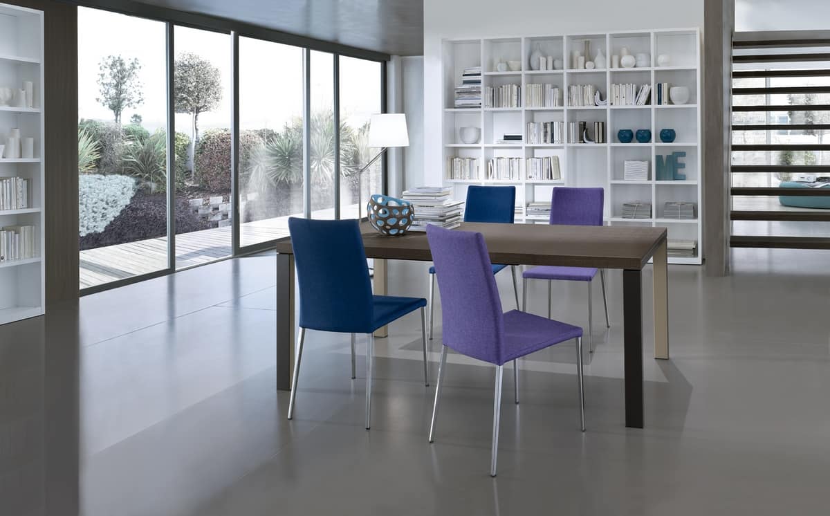 Mesa de diseño simple, tanto para el almuerzo como para la sala de estar. Con marco de acero cromado o rectangular de 40x80 mm. Tapa y extensión en cristal o laminado.