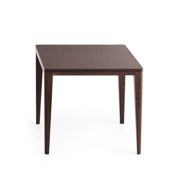 Mesa 80x80xH.76 cm, 4 patas de madera cuadradas macizas con borde exterior redondeado. Laminado superior H.25 mm con borde ABS y 4 esquinas redondeadas. Rieles entre las piernas.