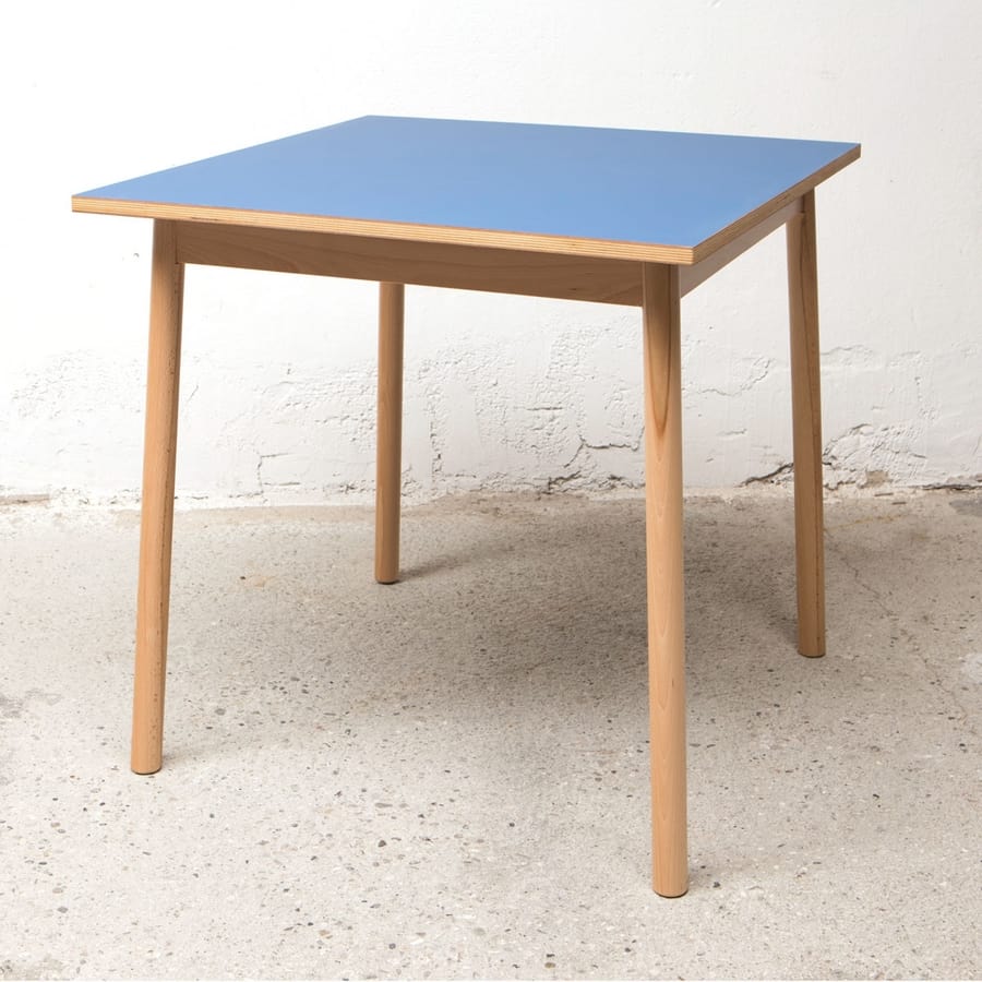 Mesa con marco en madera de haya natural y asiento en contrachapado de haya cubierto en laminado FENIX, en diferentes colores: negro, azul, verde y blanco. Una mesa de salida con propiedades inusuales.