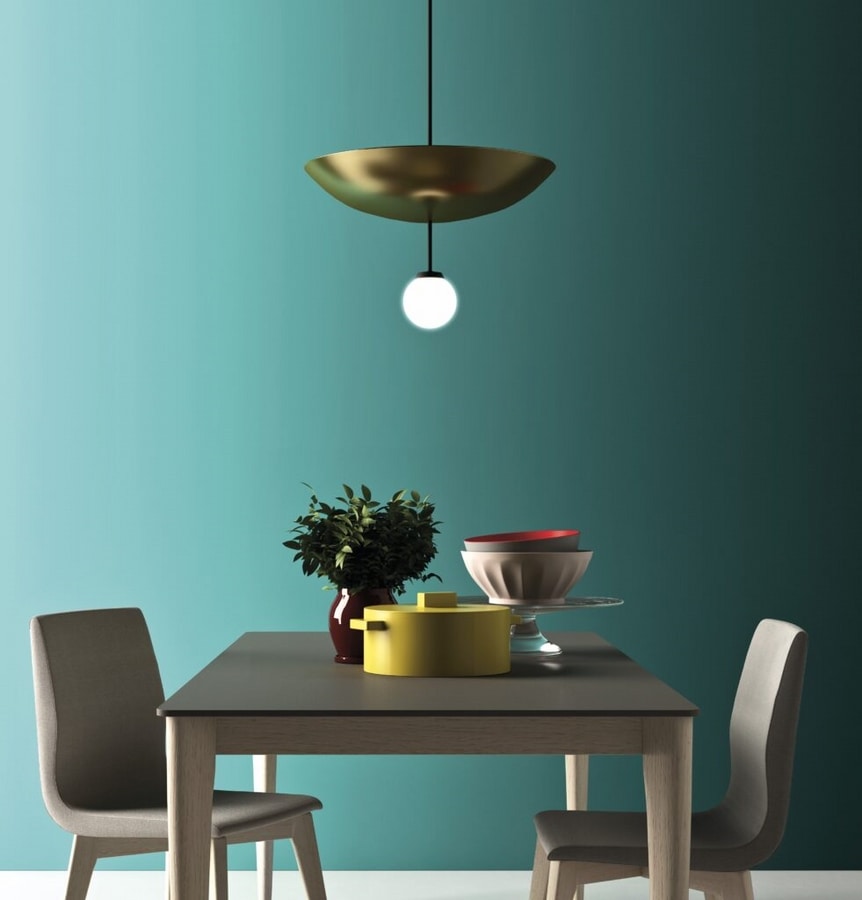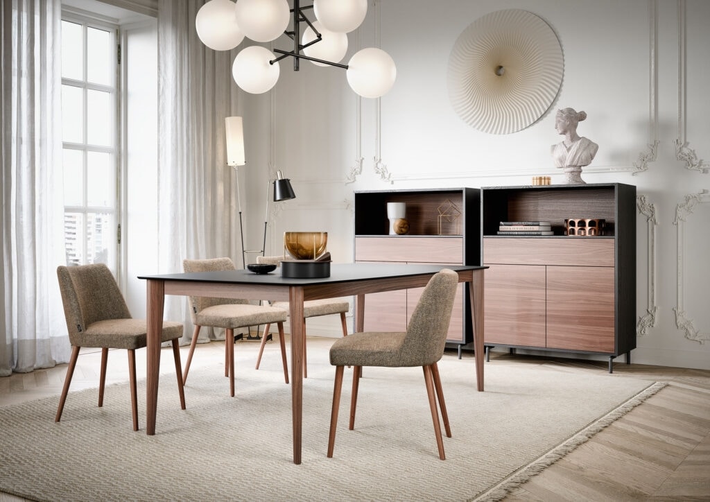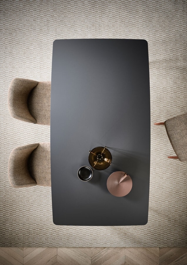 La mesa Opera, caracterizada por las patas giradas hacia el interior de la parte superior, presenta un cartel regular, riguroso en su simplicidad de diseño.