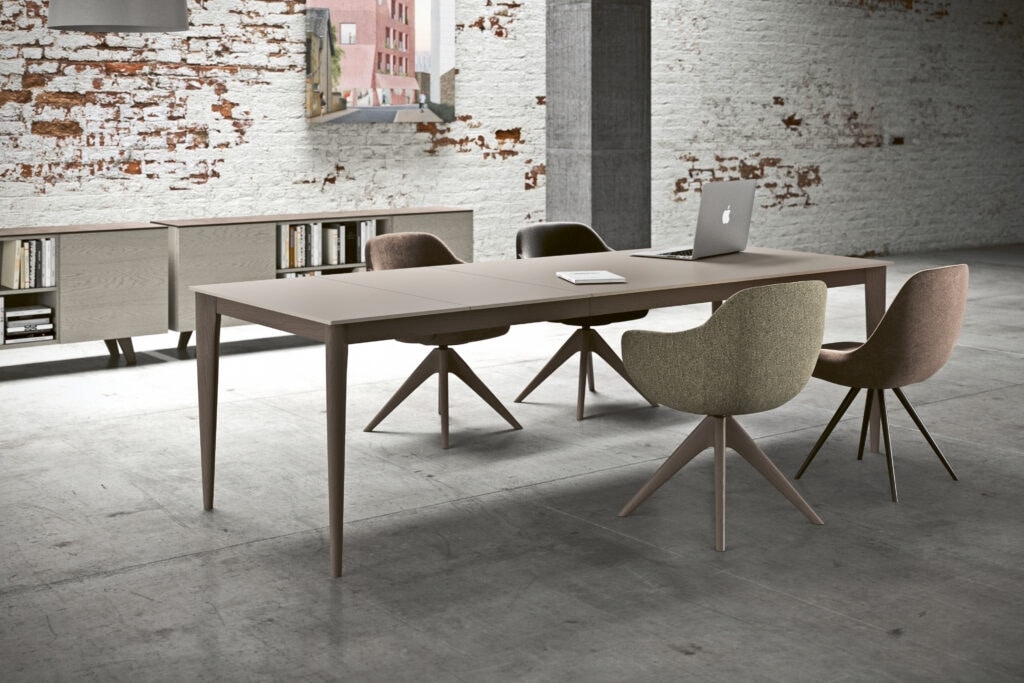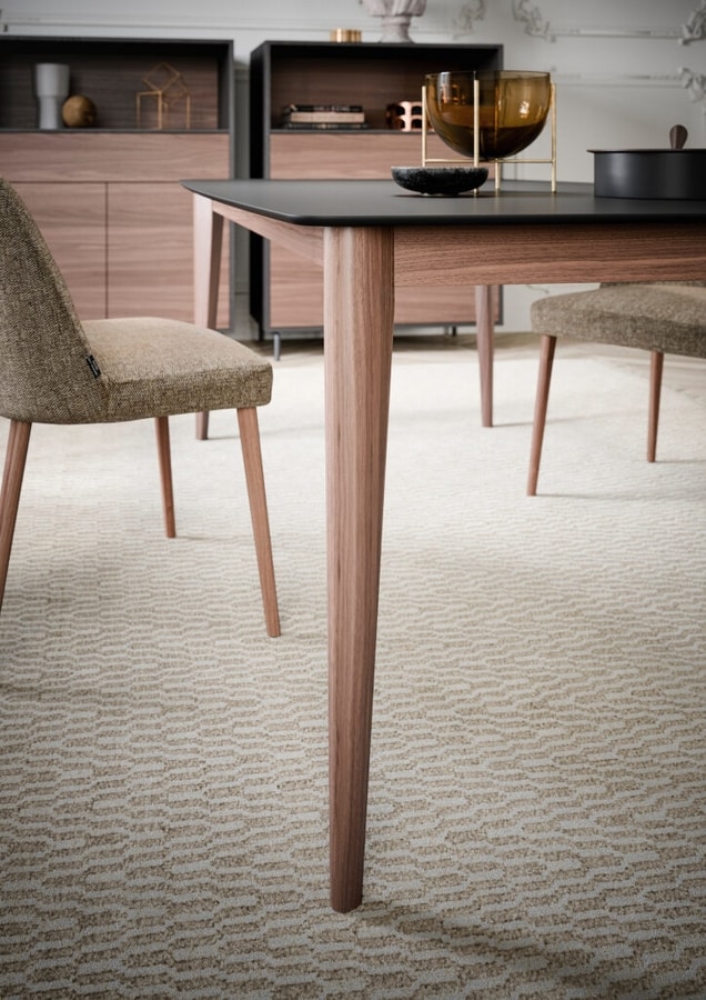 Solicitar precios Productos similaresMesa cuadrada, rectangular, redonda, ovalada o curva (fija o extensible) en roble macizo o nogal, con patas cónicas y redondeadas, con púas y pegadas: parte superior personalizable con diferentes materiales y acabados (requerido también con corte de 45°). Encimera en madera, fenix, hpl o cerámico.
