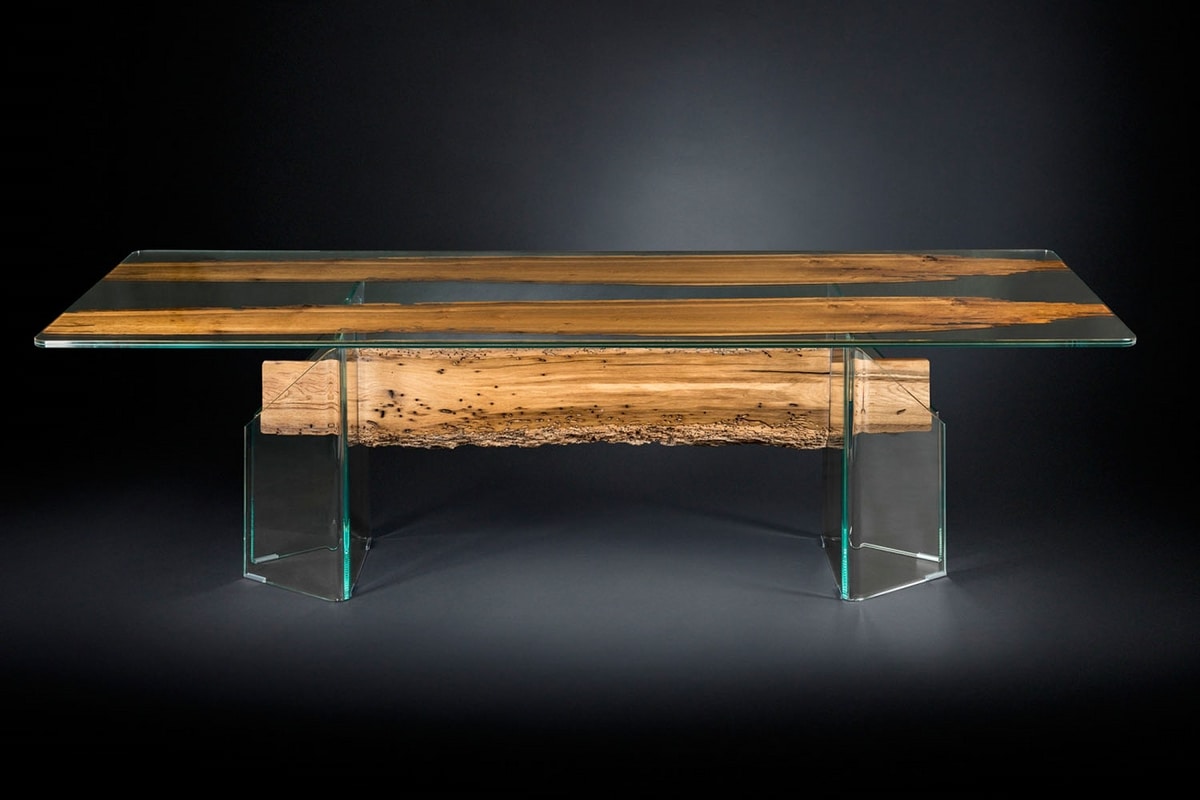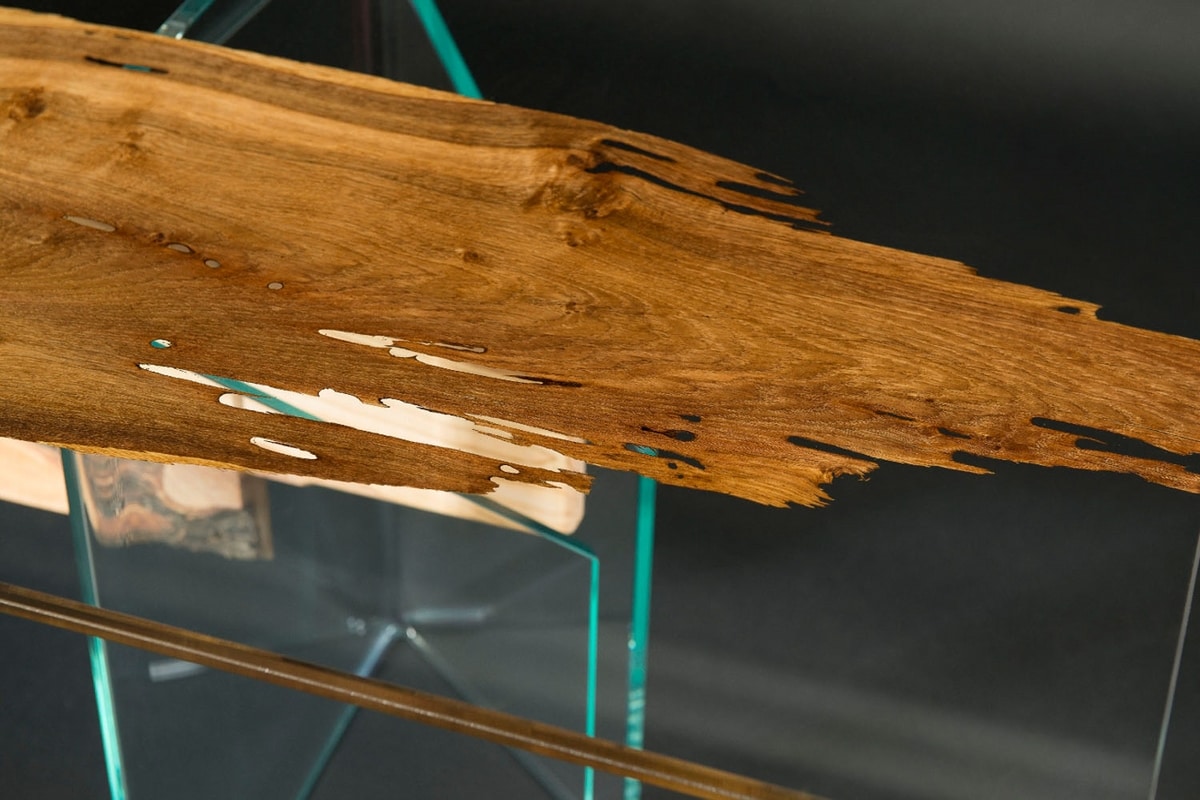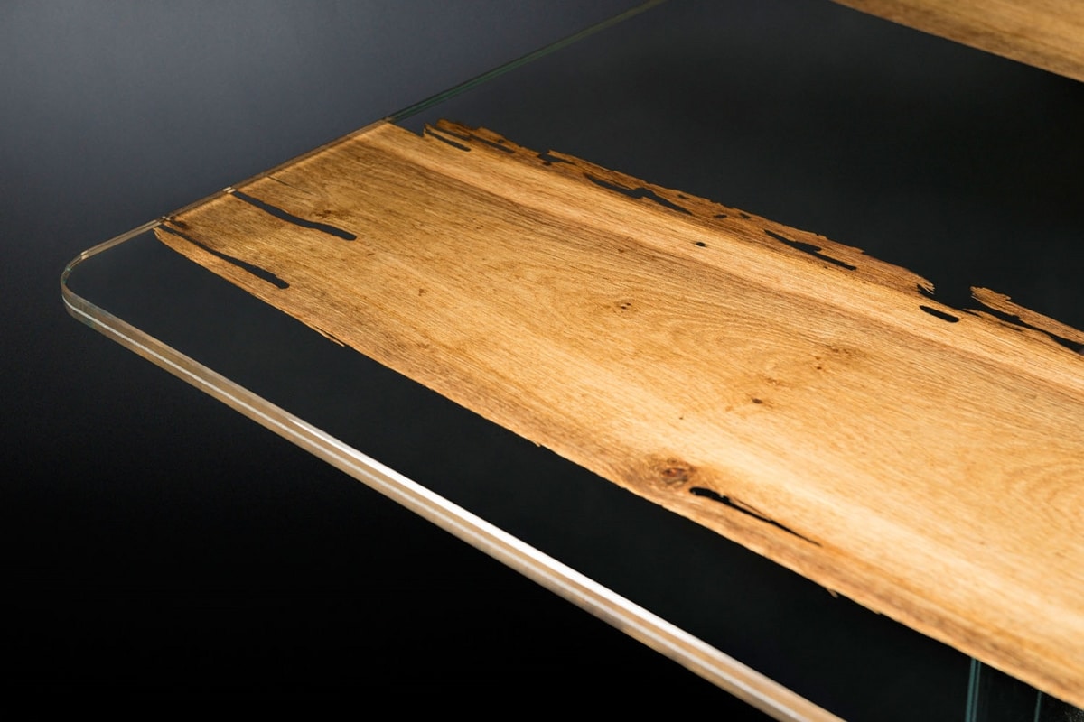 El tablero está formado por dos capas de vidrio de 10 + 10 mm que contienen finas secciones de briccola, sostenidas por dos patas de vidrio unidas por una viga de roble envejecido.