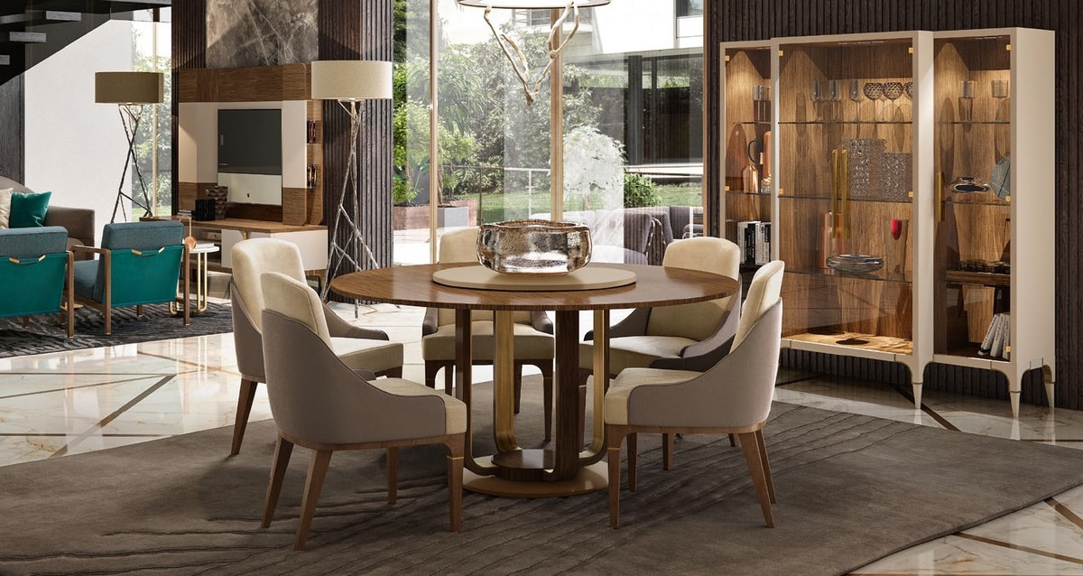 La zona de estar resulta luminosa y acogedora, cualidades preciosas que surgen de las exitosas combinaciones de esencia de nogal, lacados claros, metales dorados y tejidos en tonos a juego. Es una invitación diaria a la serenidad y la relajación, en su forma más buscada.