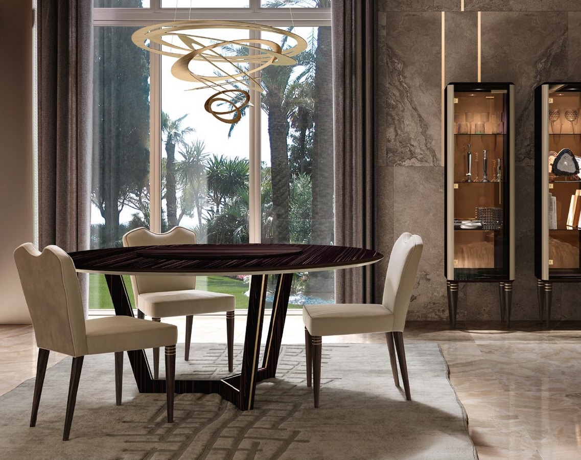 Autoritaria y acogedora al mismo tiempo, la sala de estar es un canto a la convivencia y al bienestar. La mesa, redonda o rectangular, tiene un precioso tablero oscuro chapado en ébano que combina con elegancia con la consola, mientras que la zona de relax destaca por su sobriedad y comodidad.