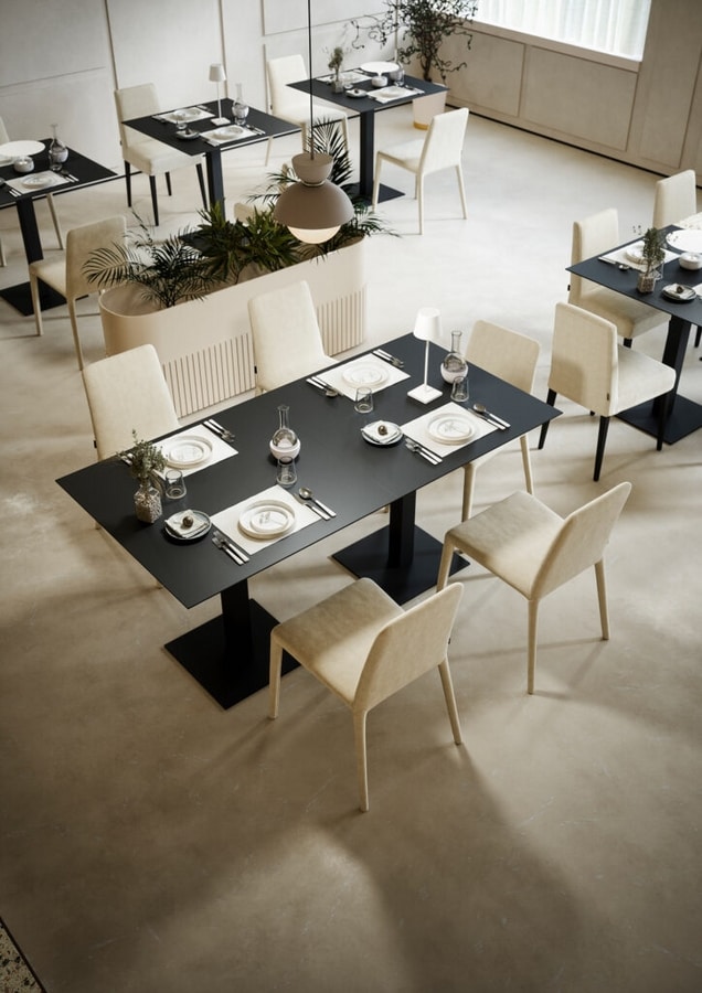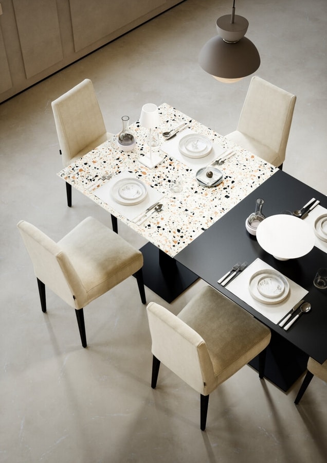 La pata central única permite de hecho optimizar u ocupar el espacio ocupado por la mesa permitiendo la combinación de un mayor número de sillas, en comparación con una solución clásica de una mesa de cuatro patas.