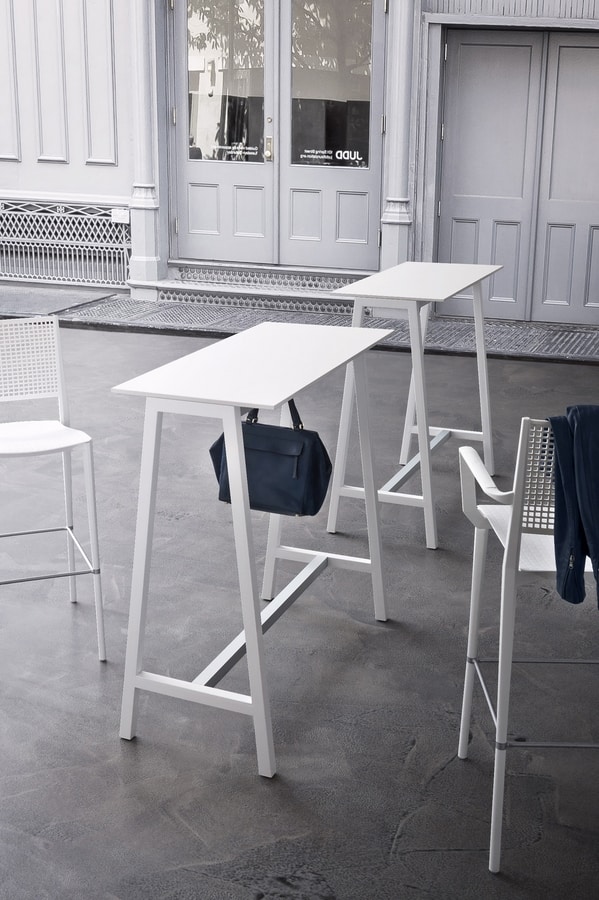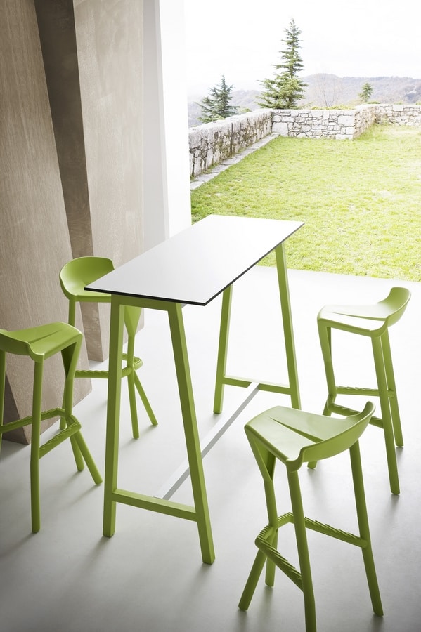 Mesa alta con estructura en metal y tecnopolímero, tablero en compactop, perfecta también para exteriores.