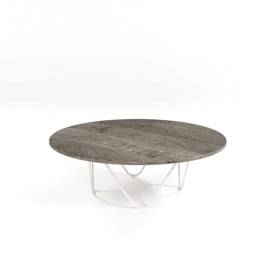 Mesa de centro con base en hierro macizo forjado a mano; estante disponible en las siguientes versionesi: - mármol (presentado aquí en la versión de mármol blanco de Carrara con base en acabado de hierro envejecido - "anticato ferro antico"); - cristal templado extraclaro (presentado aquí con base en acabado de hierro envejecido "anticato ferro antico"); - madera nudosa contrachapada de roble (presentada aquí en versión oxidada natural con base en acabado blanco envejecido - "anticato bianco antico"); - MDF lacado; - MOD compacto HPL.