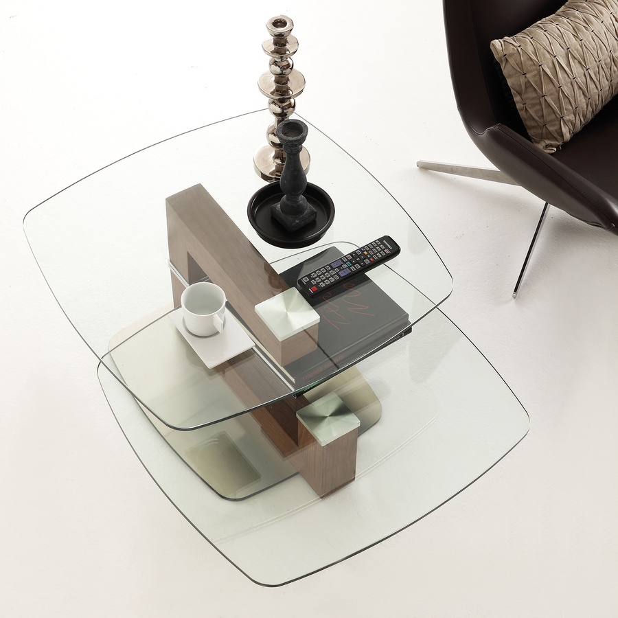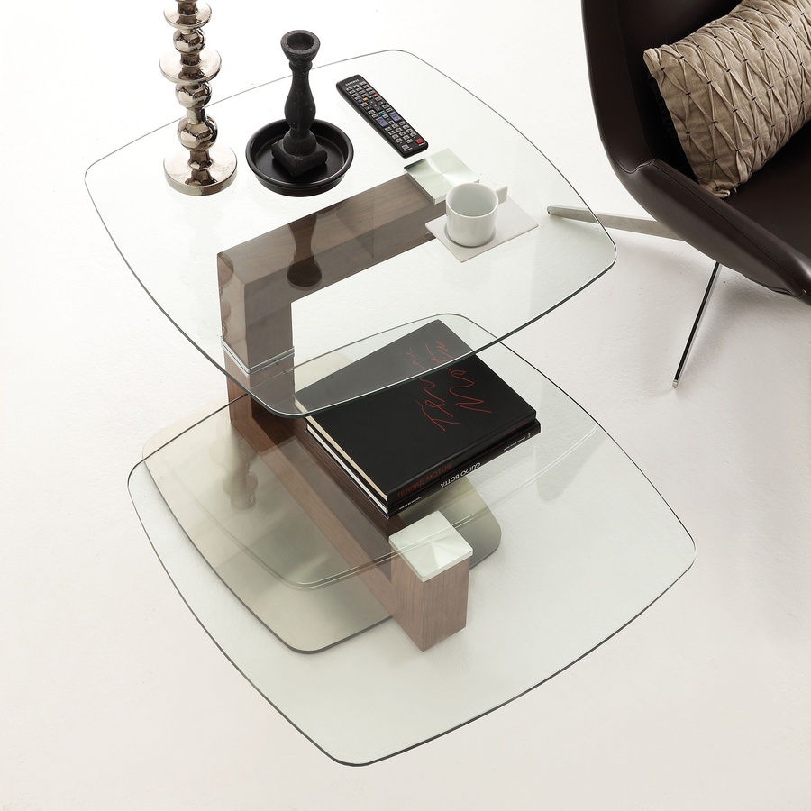 Moderna mesa de centro en cristal y nogal, con tapa giratoria