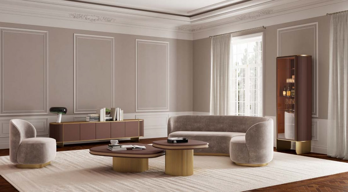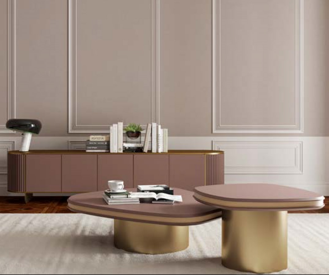 Cada mesa de centro descansa sobre una única base cilíndrica de generoso diámetro, lo que garantiza estabilidad y un fuerte impacto visual. La tapa está realizada con una estructura sándwich de madera lacada de formas irregulares, que garantiza ligereza y un contraste cromático elegante y refinado.