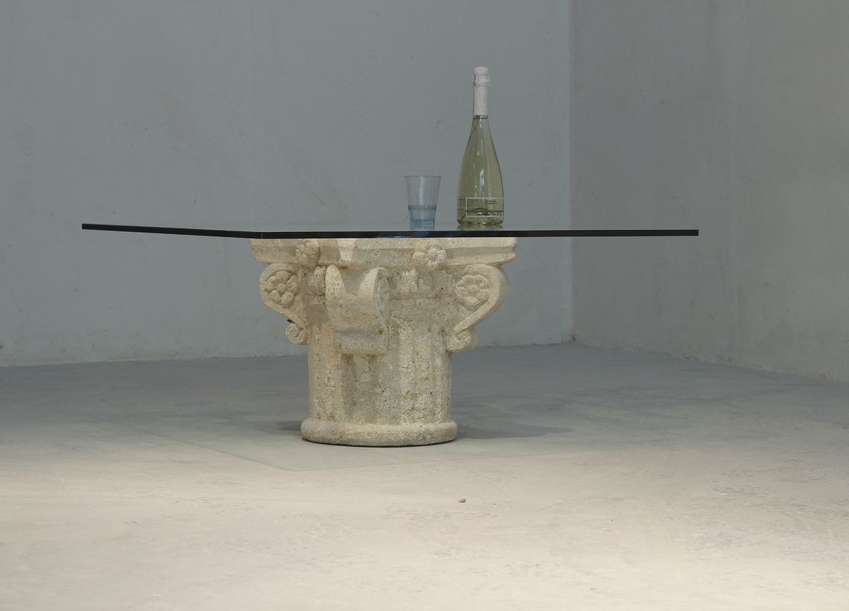 Mesa de centro con tapa de cristal, base de piedra decorado a mano
