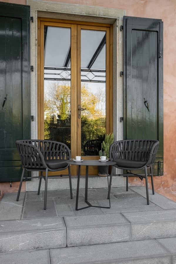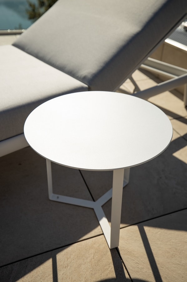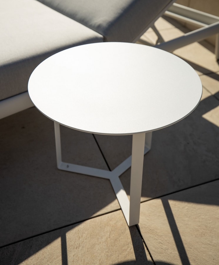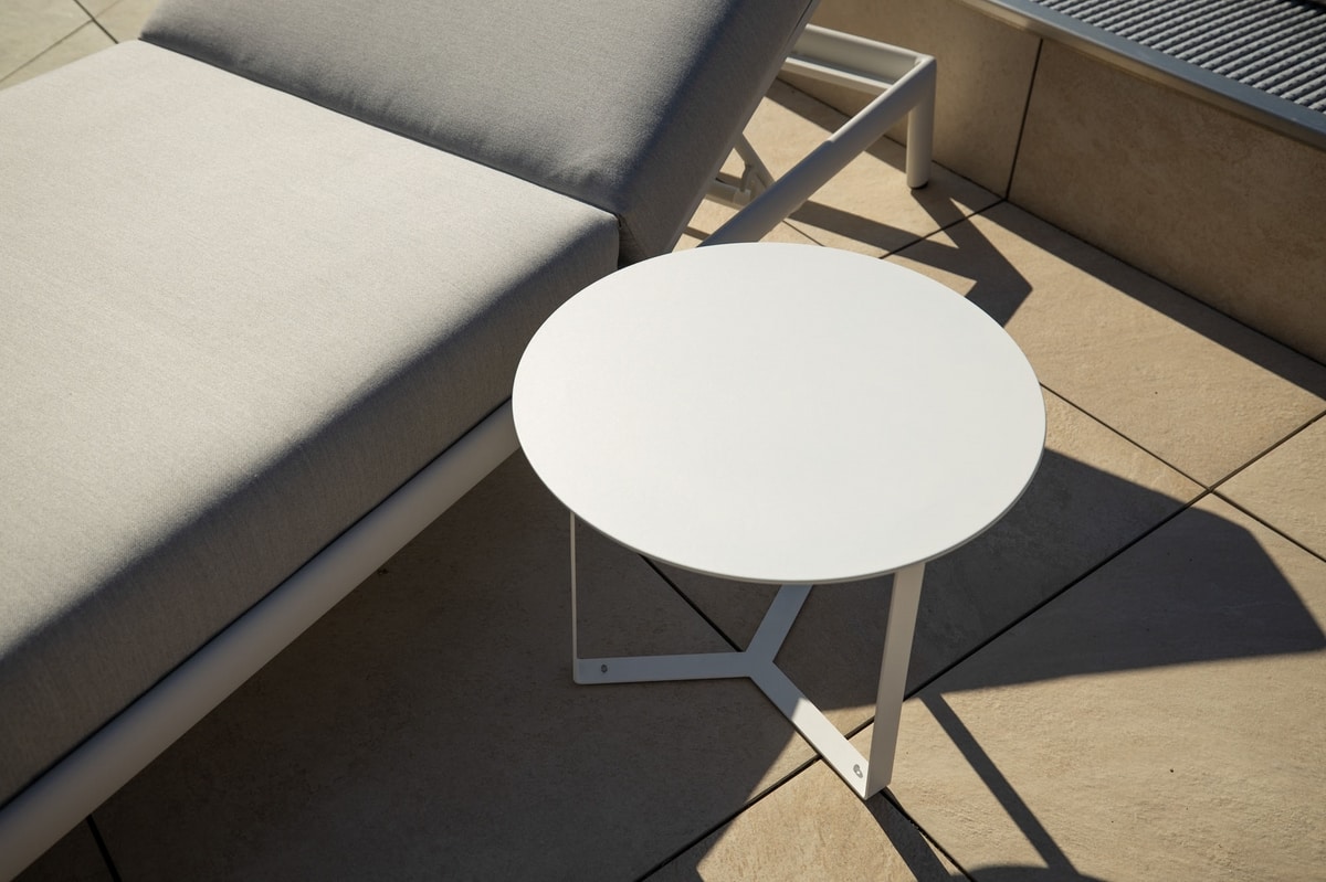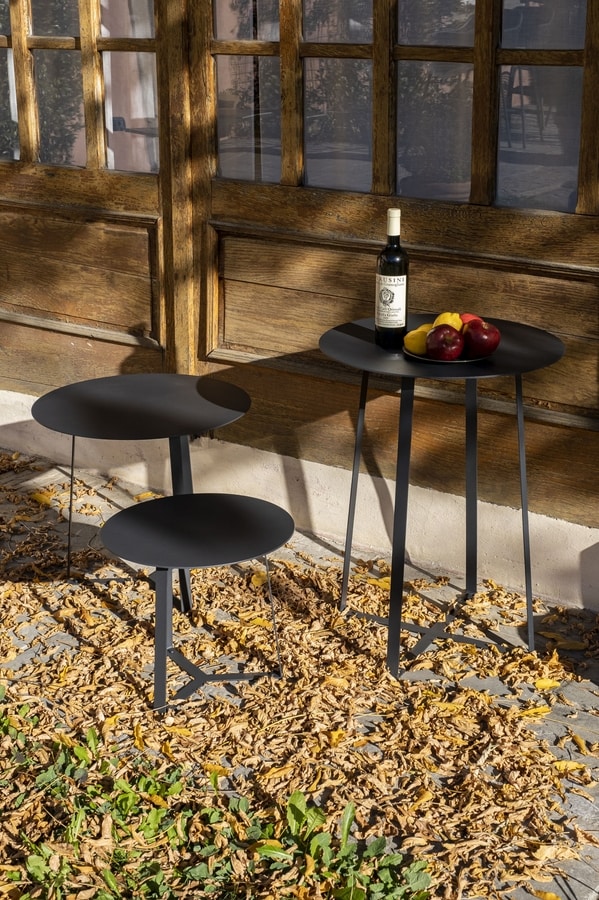 Mesa de centro de metal pintado con pintura en polvo, tapa de chapa galvanizada. Otros acabados RAL disponibles bajo pedido. Tratamientos de cataforesis y galvanizado para zonas marinas disponibles bajo petición.