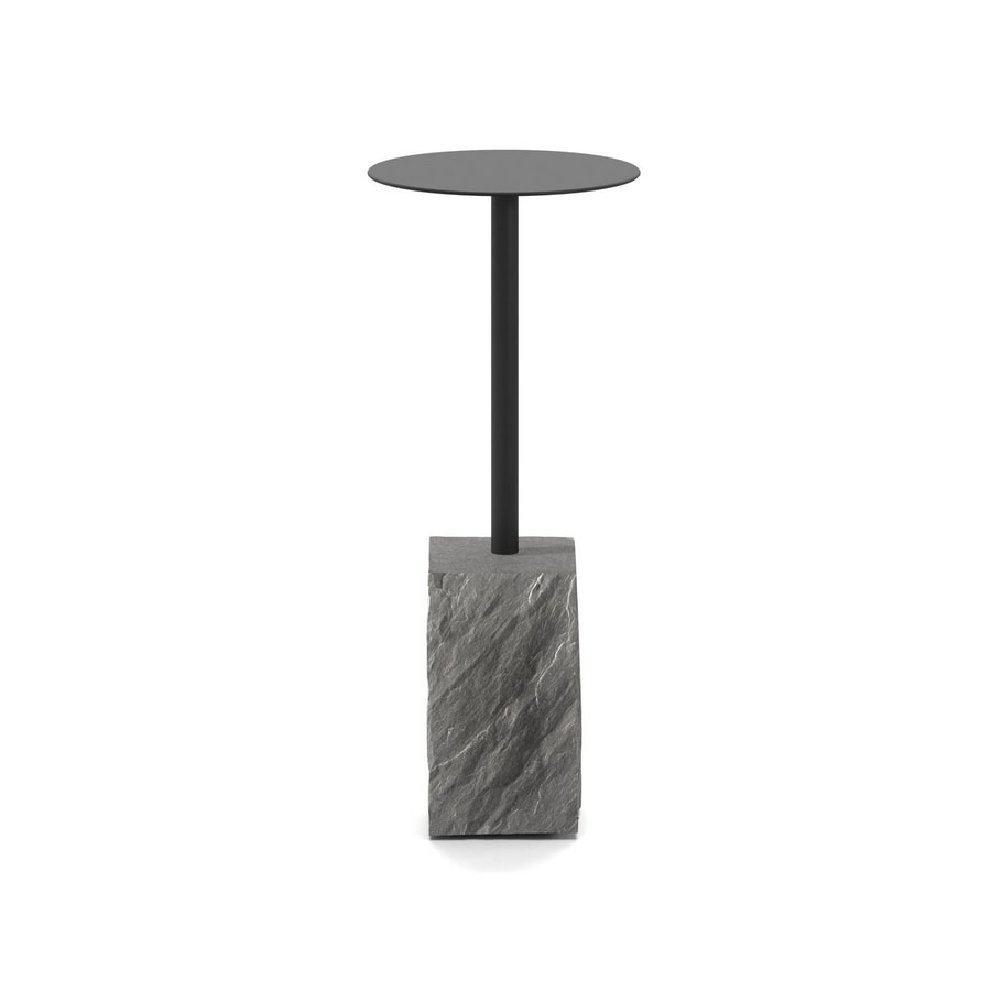 Mesa auxiliar con base de Pietra Piasentina, columna de acero pintado y tapa de 22 cm de diámetro.