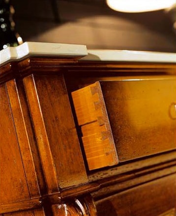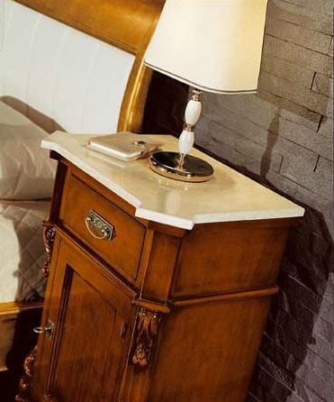 Mesita de noche de nogal macizo, reproducción estilo 800. Tapa de mármol. El interior de los cajones tiene un acabado en cola de milano.