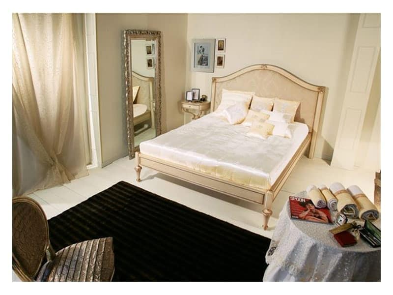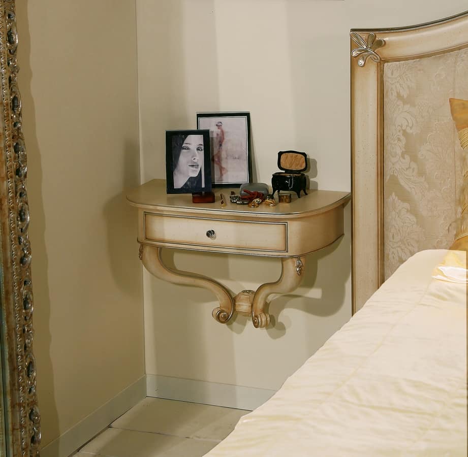 Mesita de noche en madera de haya con acabado en blanco envejecido. Plata acentos de la hoja. Adecuado para habitaciones clásicas y de lujo.
