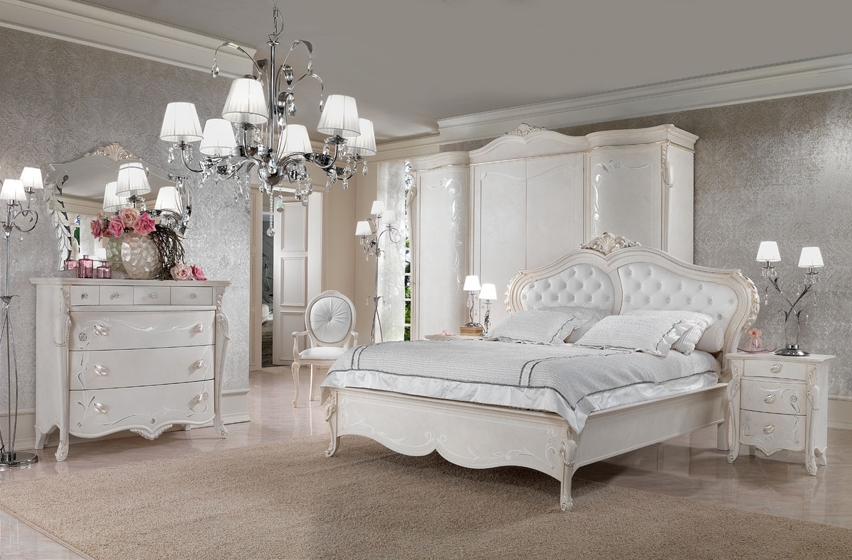 Mesa de noche de estilo clásico, en madera lacada con decoraciones artesanales. Equipado con 3 cajones.