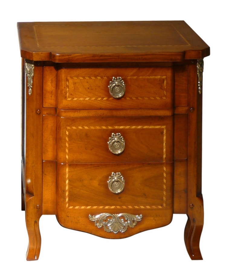 Mesita de noche de nogal inspirada en el estilo Régence francés del siglo XVIII. Incrustaciones de varios tipos de madera, dispuestas en cuellos contrastantes y adornadas con detalles de latón fundido. Frente con diferentes profundidades, con tres cajones de diferentes tamaños. Piernas en forma.