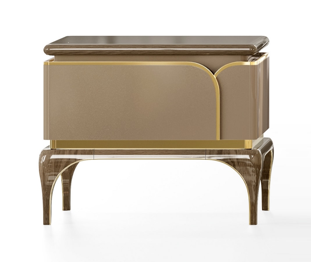Solicitar precios Productos similaresMesita de noche con estructura de madera contrachapada y MDF chapado, marcos y base de fresno. Acabado brillante Santorini Sand. Perfil metálico acabado oro pulido. Cajones equipados con guías Blum. Frentes en acabado lacado brillo.