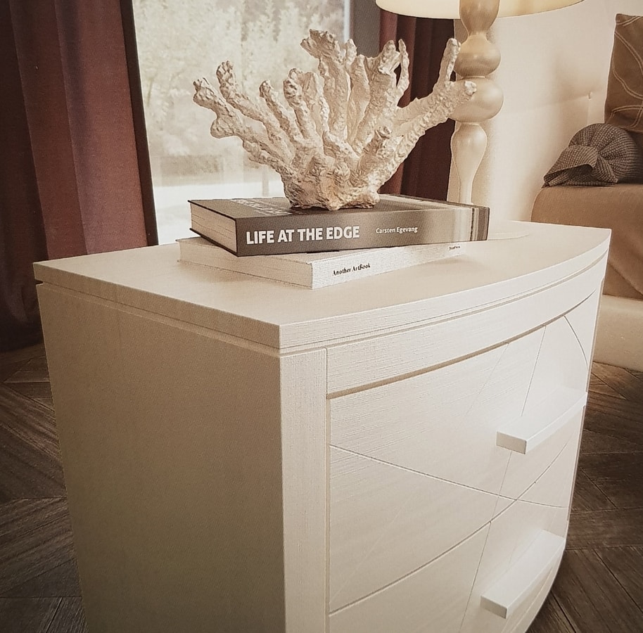 Mesita de noche con 2 cajones con grabado en el acabado lacado frontal, apertura y deslizamiento sobre rieles de metal con amortiguación.