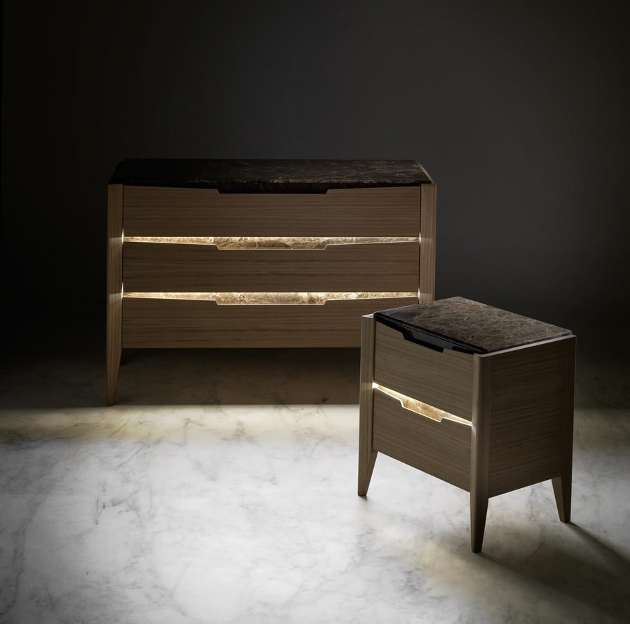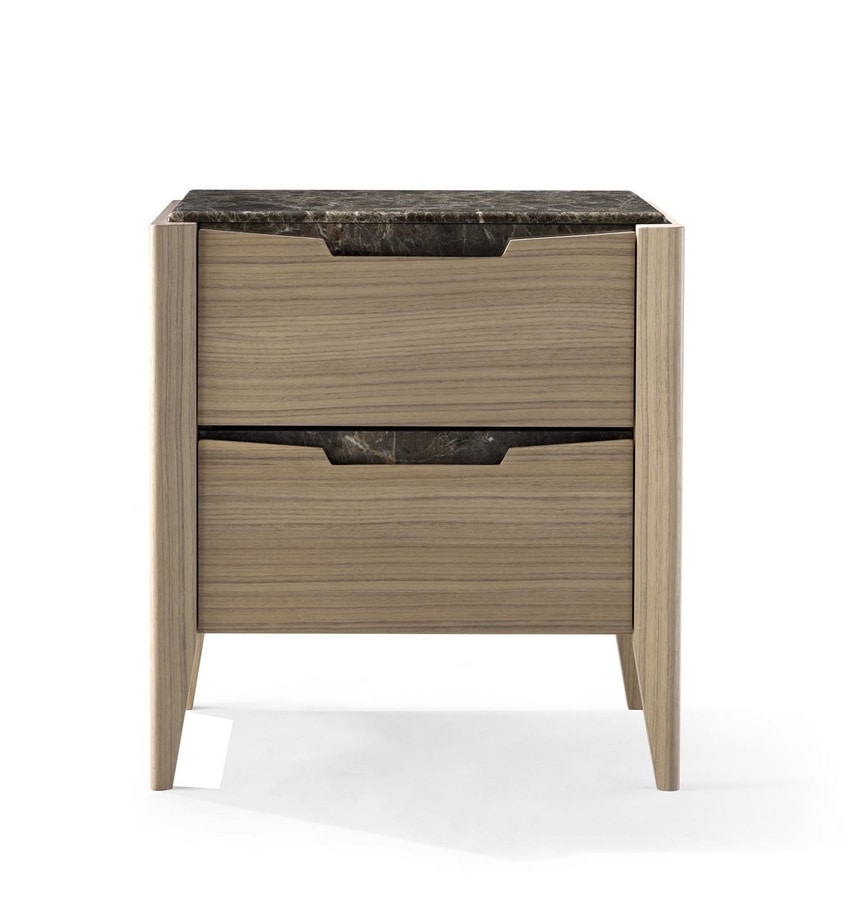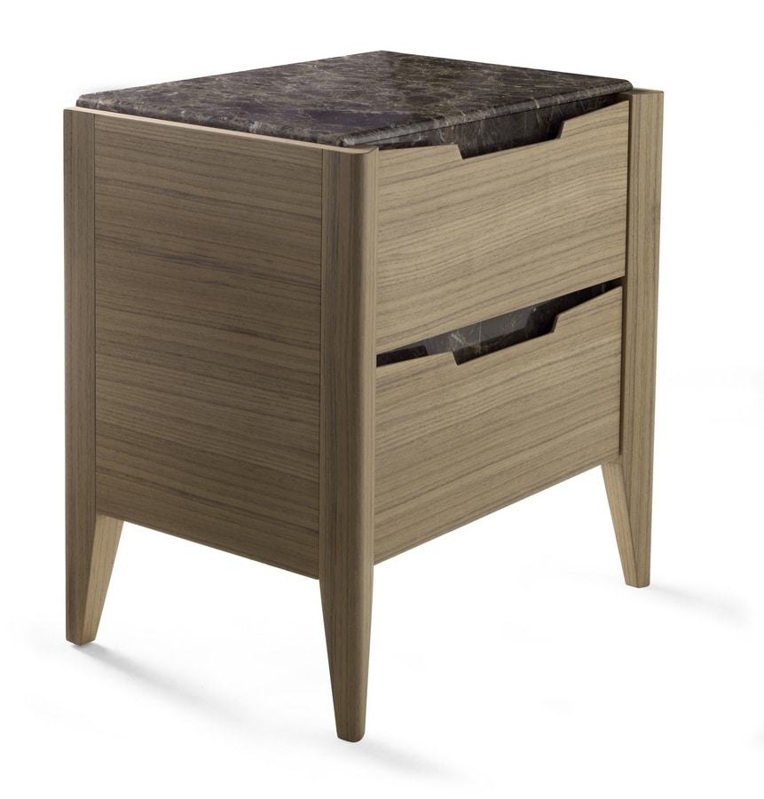 Mesita de noche con mármol Emperador oscuro, con dos cajones sobre guías con cierre suave.