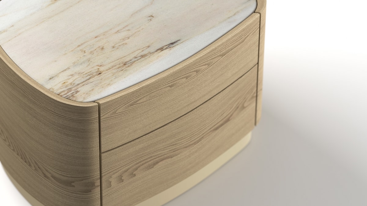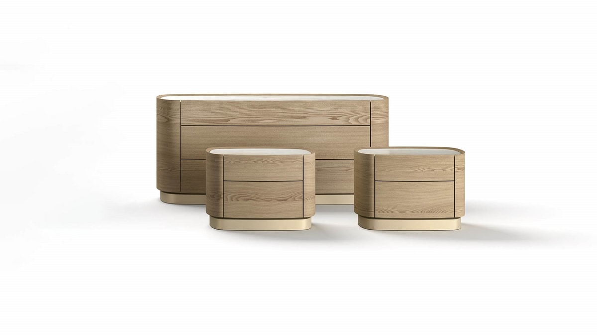 Grace es una familia de cómodas y mesitas de noche de líneas a la vez armoniosas y fuertes. Se adaptan perfectamente a la gama de camas de Elli, que siempre presenta una elegancia atemporal. La estructura y los frentes de los cajones son de esencia de madera que se funde pacíficamente con el soporte metálico. La encimera está disponible en numerosos materiales: desde esencia de madera tono sobre tono hasta vidrio lacado y mármol.