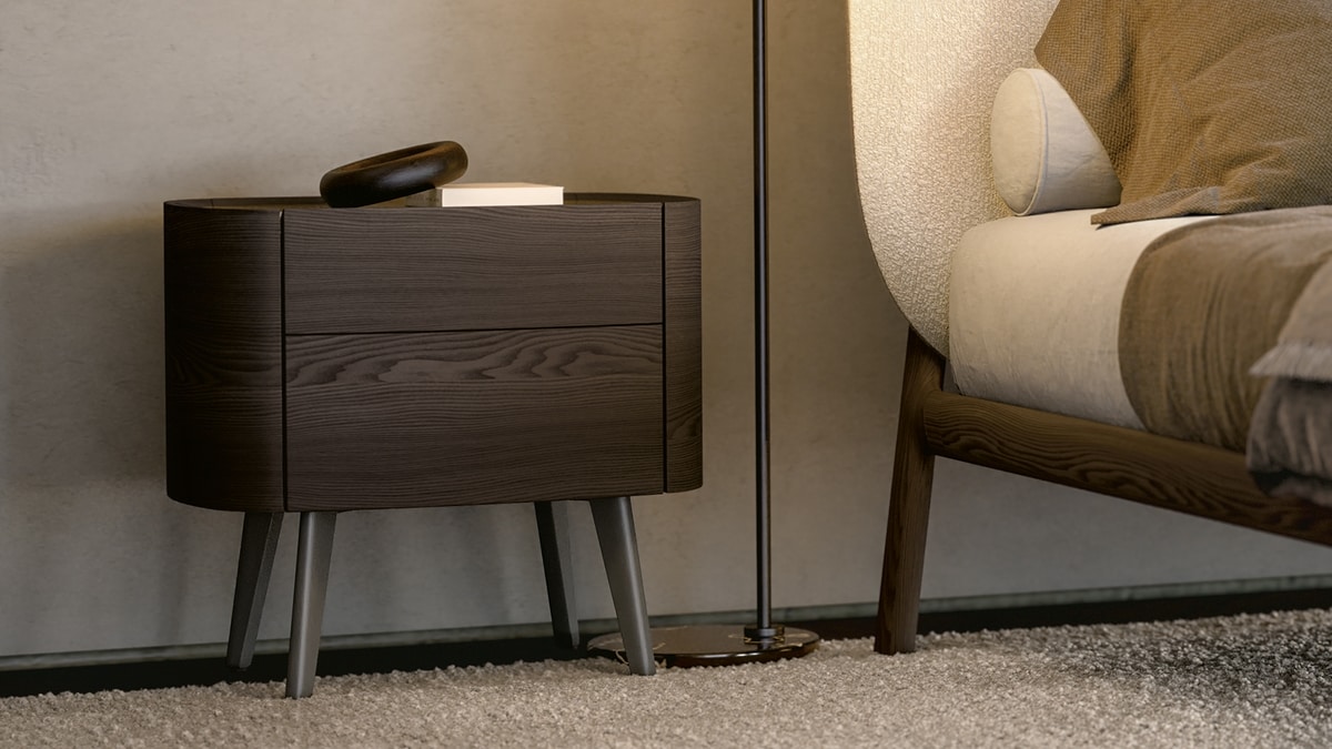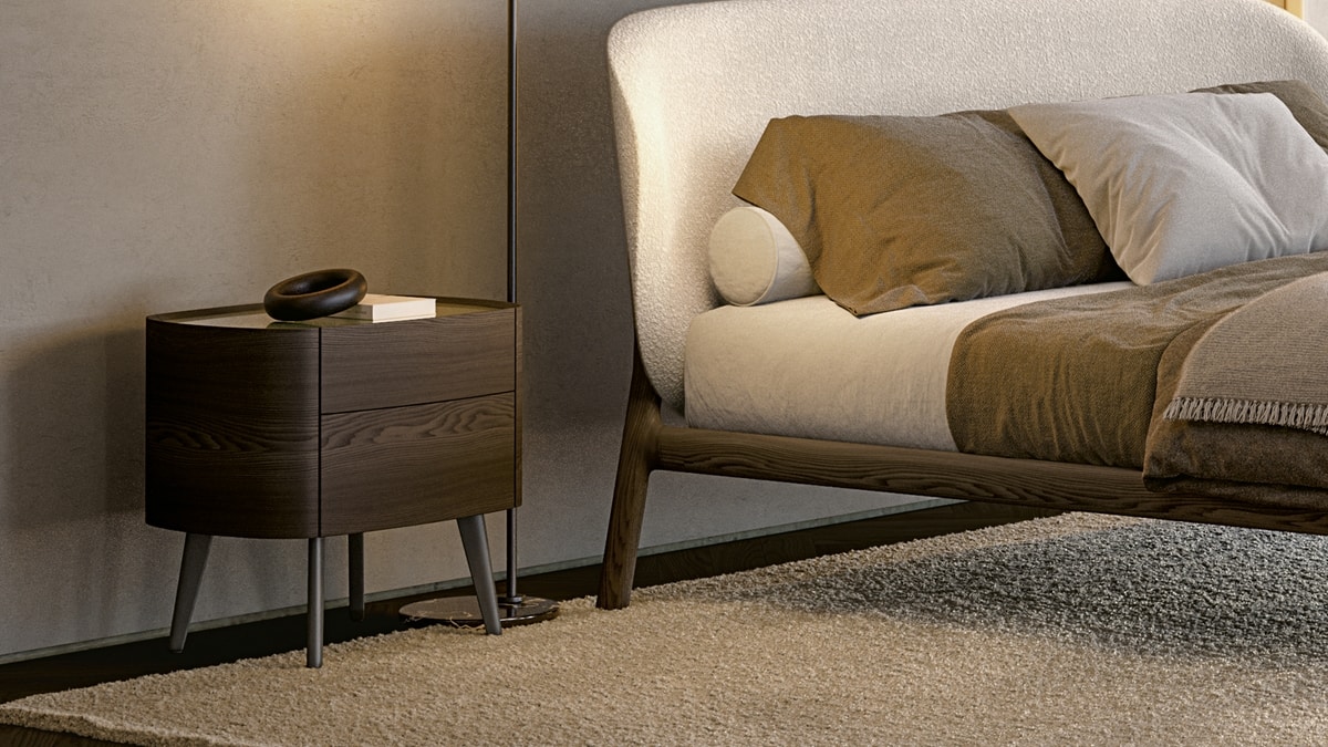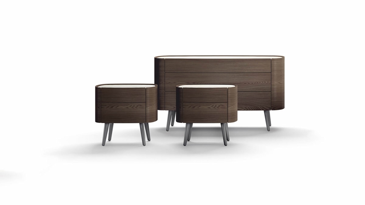 Grace es una familia de cómodas y mesitas de noche de líneas a la vez armoniosas y fuertes. Se adaptan perfectamente a la gama de camas de Elli, que siempre presenta una elegancia atemporal. La estructura y los frentes de los cajones son de esencia de madera que se funde pacíficamente con el soporte metálico. La encimera está disponible en numerosos materiales: desde esencia de madera tono sobre tono hasta vidrio lacado y mármol.