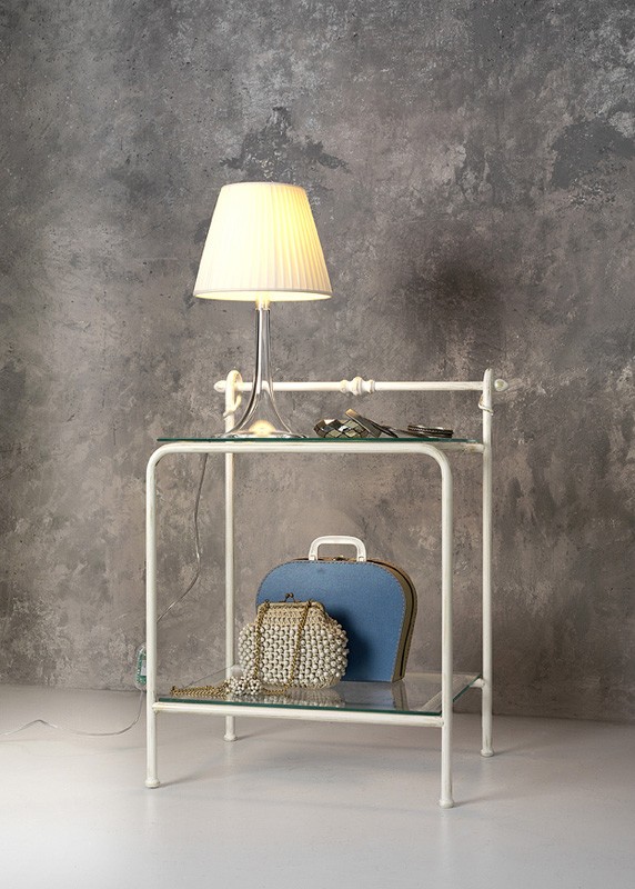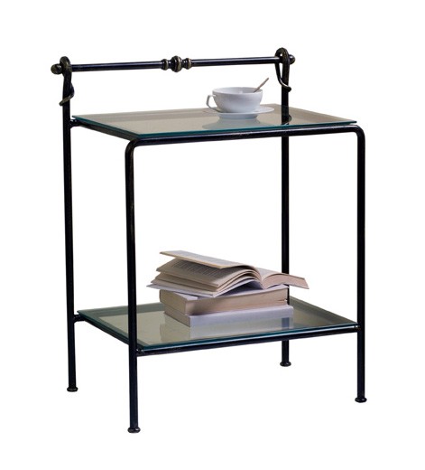 Mesilla de noche de metal con tapa de cristal transparente. El plan está disponible en cristal satinado en la solicitud.