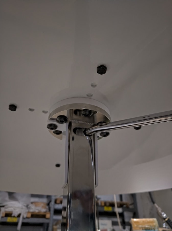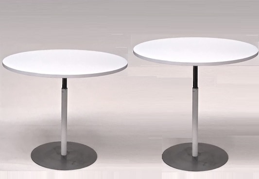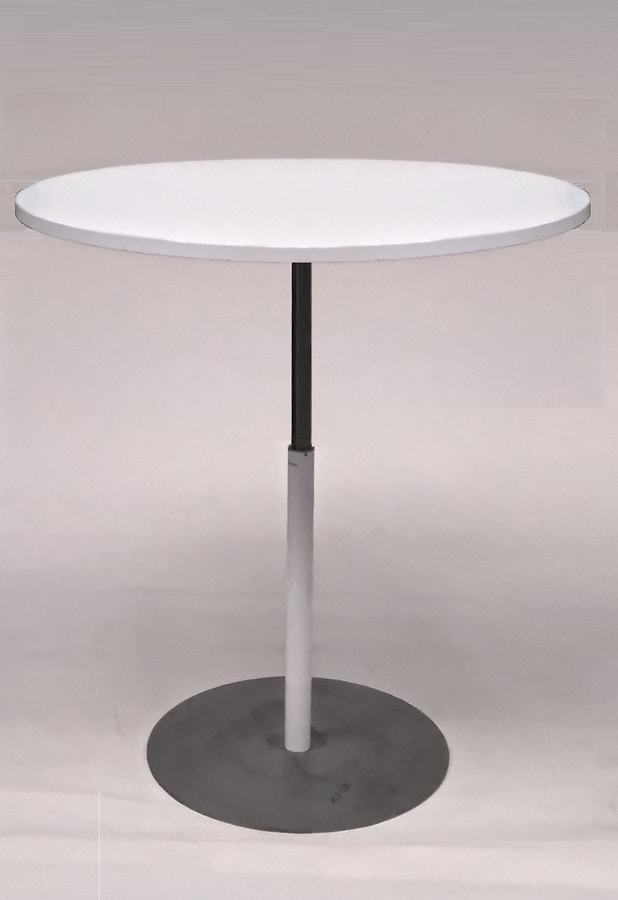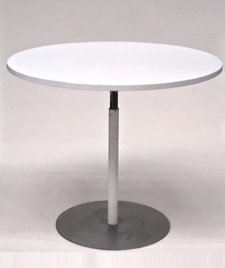 Mesa con columna de metal redonda regulable en altura y base redonda pintada o cromada.