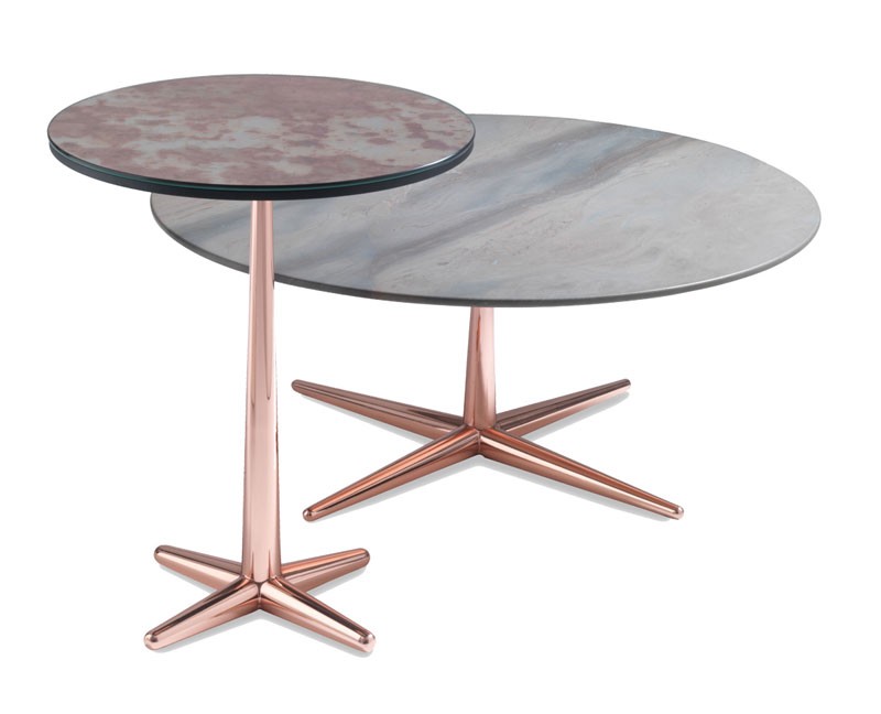 Pequeña mesa con procesado en frío en forma de cono pies, placas cortadas con láser, latón soldadas y mano frota. Galvanoplastia acabado de baño, el espesor mínimo de 25 micrómetros. Tapas disponibles: Chapa de madera de poro abierto textura cepillado, espejo, suelo de granito.