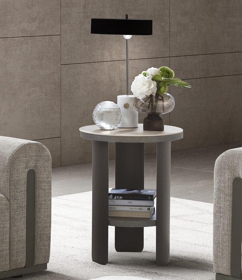 Mesa auxiliar con tapa redonda en cerámica Travertino
