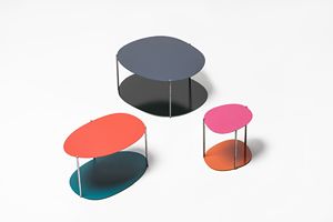 Mesa auxiliar redonda de metal, con un diseño contemporáneo.